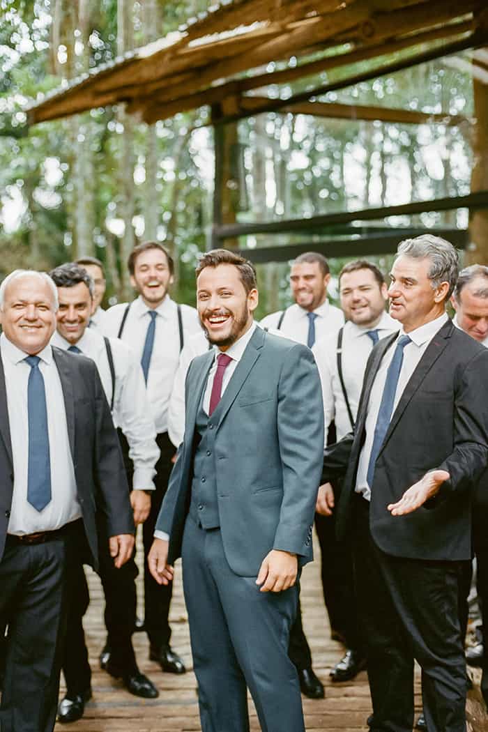Os padrinhos usaram suspensório azul, calça preta e camisa branca. As madrinhas deixamos a vontade para escolher a cor e modelo. O noivo estava de terno azul e gravata marsala.