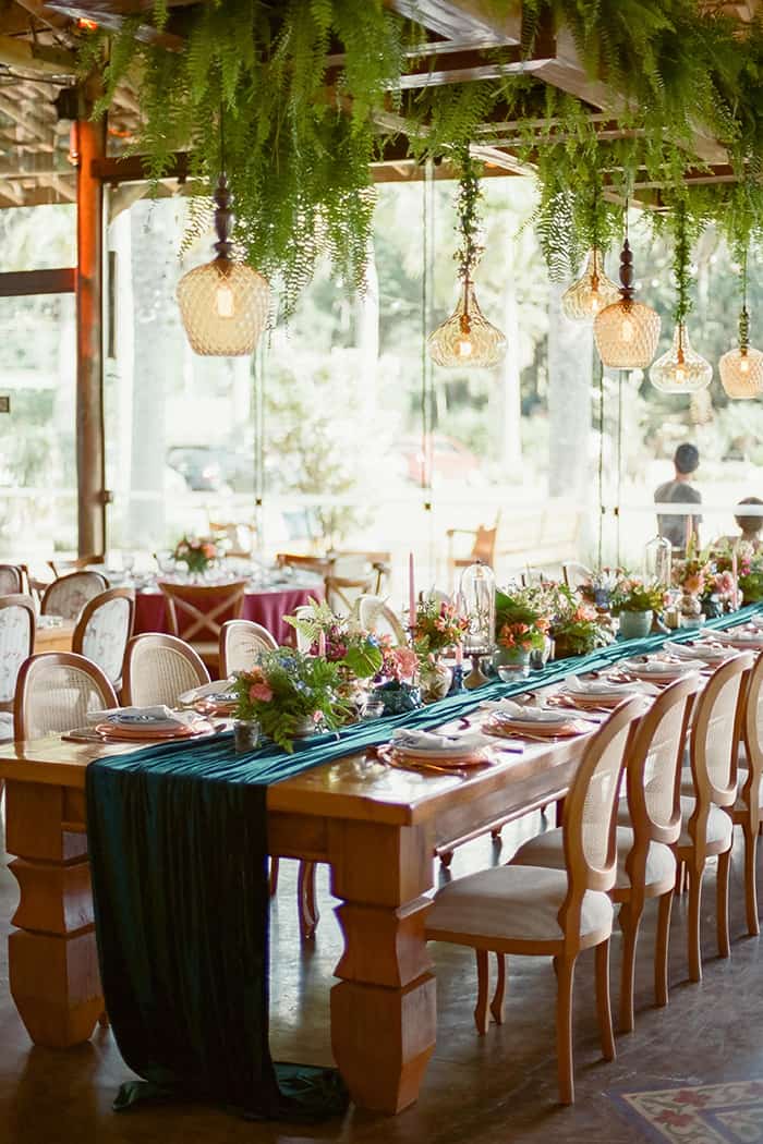 Foi um casamento que conversou bastante com a natureza, então a decoração seguiu alguma paleta de cores que tinha muito verde e cores alegres. Ela era simples e encantadora, com a grandeza da natureza, mas a leveza que tentavam carregar em suas vidas. “Ah, precisava, assim como os demais itens da festa, ser sustentável. E a equipe tirou de letra: 75% das flores eram plantadas, ou seja, podiam ser reutilizadas.”