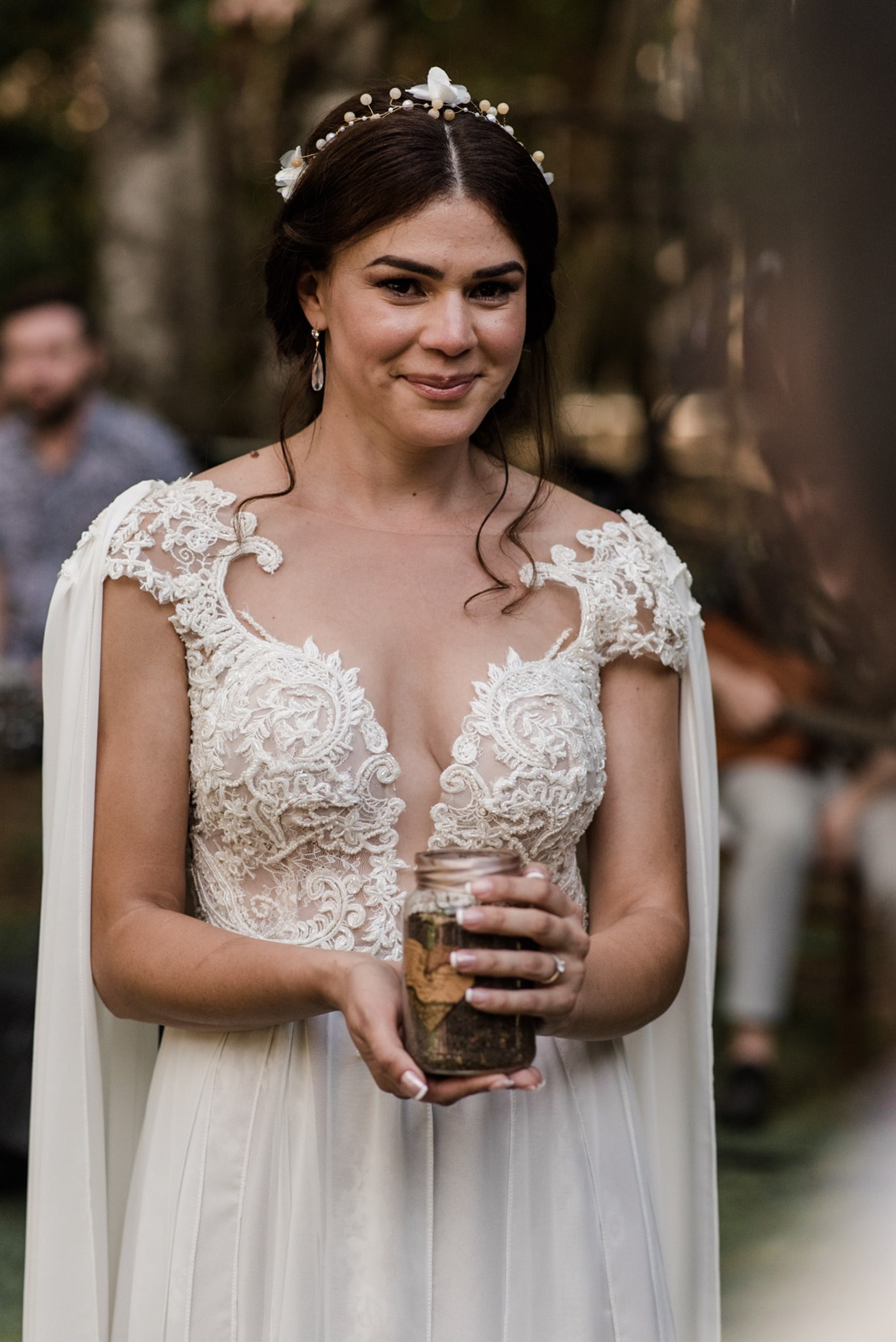 A Elisa fez os kit toiletes, que eram saquinhos com shampoo, condicionador, sabonete e hidrante que traz dos hotéis por onde passou durante o planejamento do casamento. Por fim carimbaram com os dizeres: Um banho de amor, do mundo para você! “Ah teve também globinhos terrários para compor a decoração, colocamos uma suculenta dentro de cada, globinho transparente e fizemos a caixinha de recados! Ufa, teve bastante projetinho.”