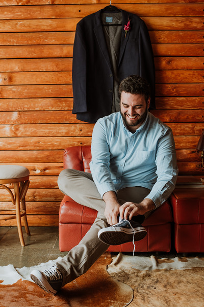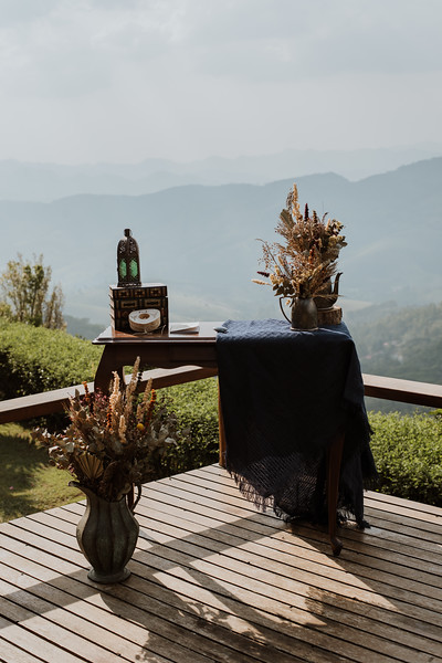 A decoração toda do casamento foi feita por eles e teve um pedacinho das famílias em cada item. “Minha irmã é decoradora e pegamos vários itens com ela, além de garimparmos itens com toda a família, como tapete, almofadas, velas, vasos. Montamos a decoração antes para ver como ficaria, tiramos fotos e no dia replicamos a decoração nós mesmos.” Compraram flores secas e levaram todos os arranjos já prontos para a viagem. “O item mais legal foi o meu tênis, que eu bordei um coração durante a viagem de carro.”