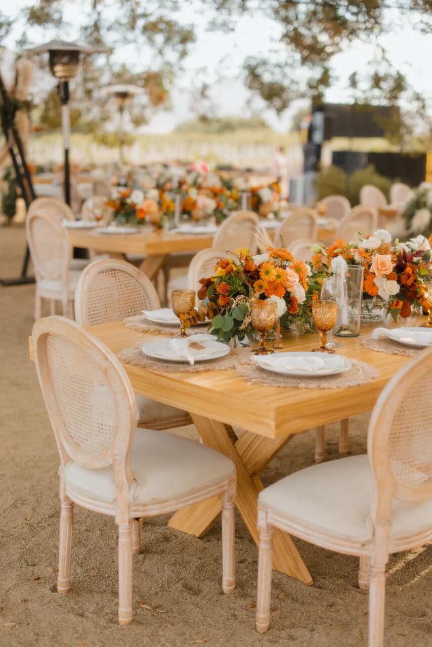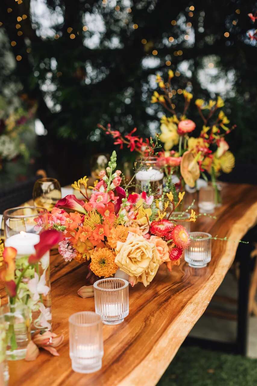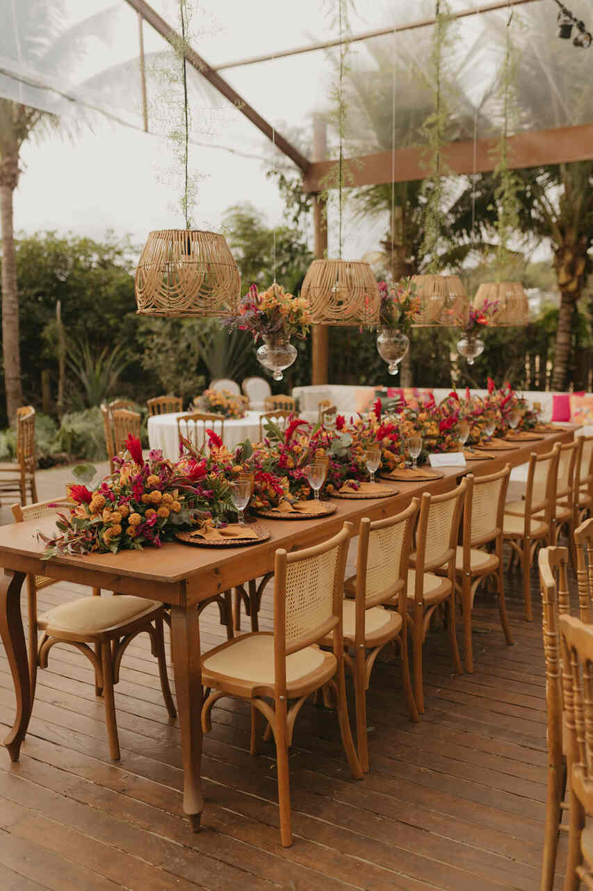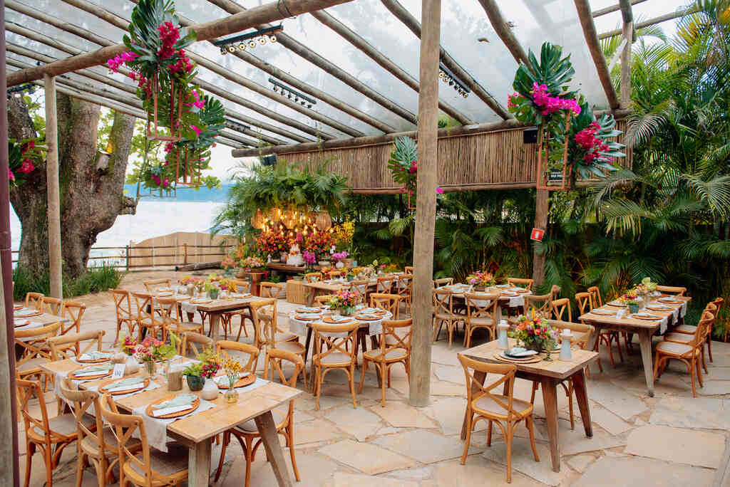 Aqui, a regra é misturar o despojado com o sofisticado: flores exóticas, frutas na decoração, tecidos leves e um clima que faz todo mundo se sentir à vontade.