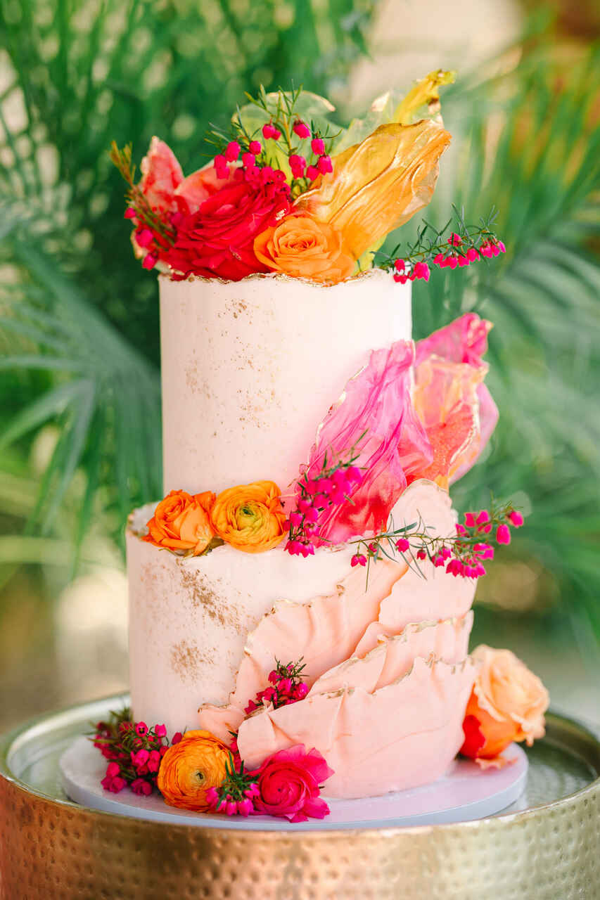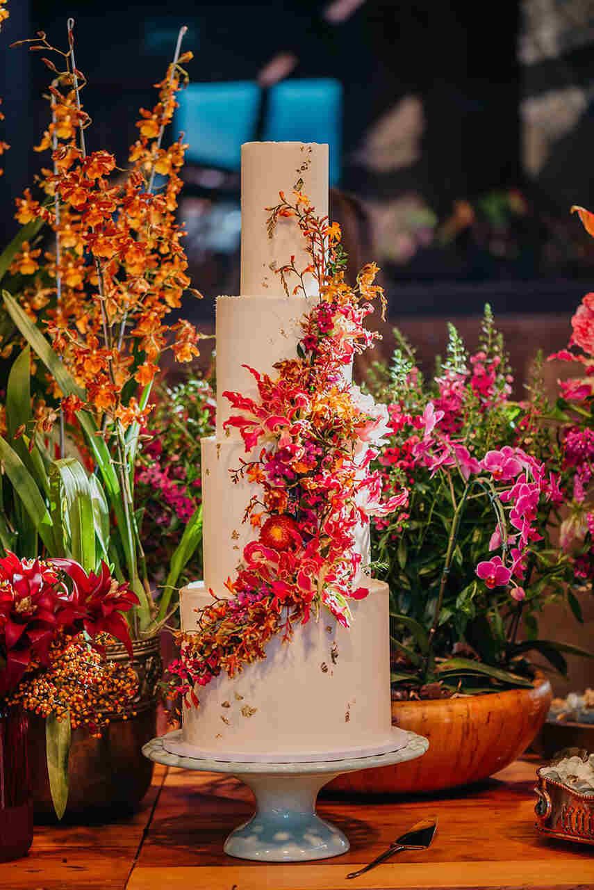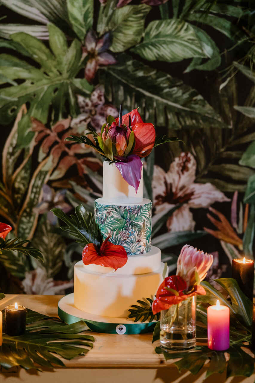 A escolha do bolo em um casamento tropical não segue regras rígidas. Ele pode ser tanto uma peça mais minimalista quanto uma proposta mais chamativa com muitas cores e elementos. Inspirados na natureza, eles podem incorporar texturas, além de cores que vão do branco clássico a tons quentes como coral, amarelo e verde, laranja. Decorações com flores tropicais, frutas frescas, folhagens são muito comuns.