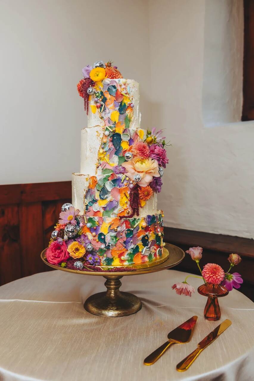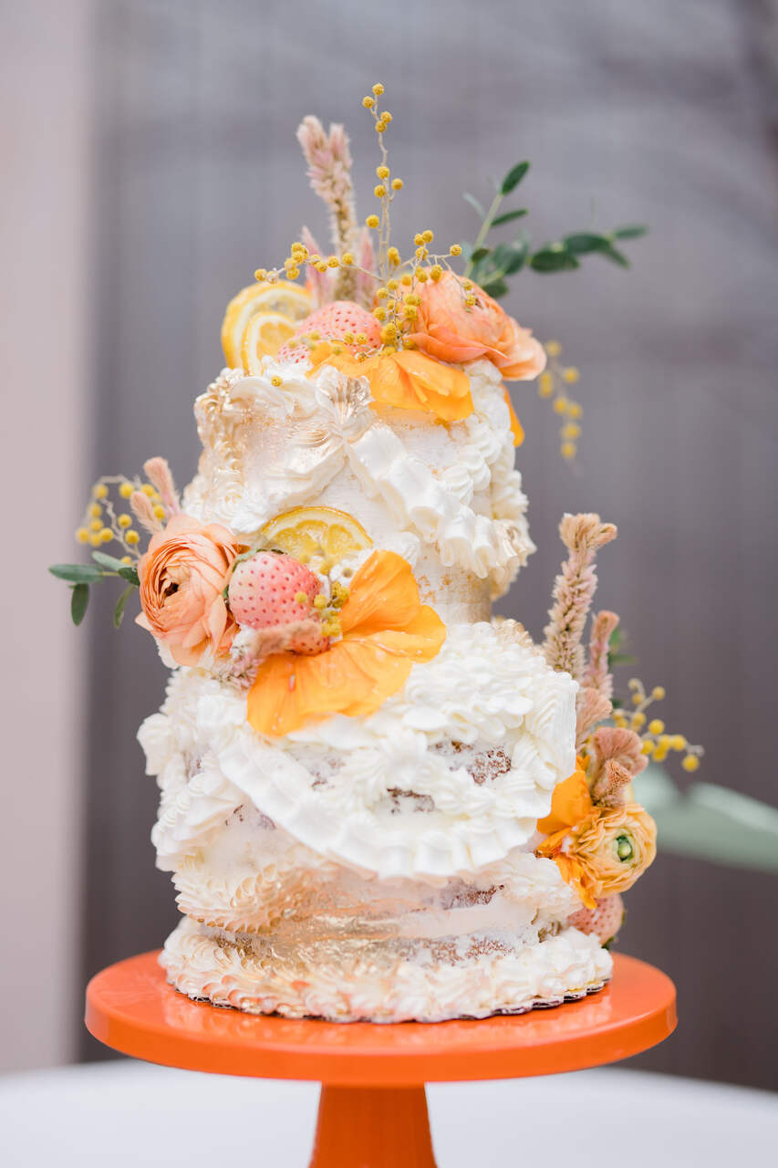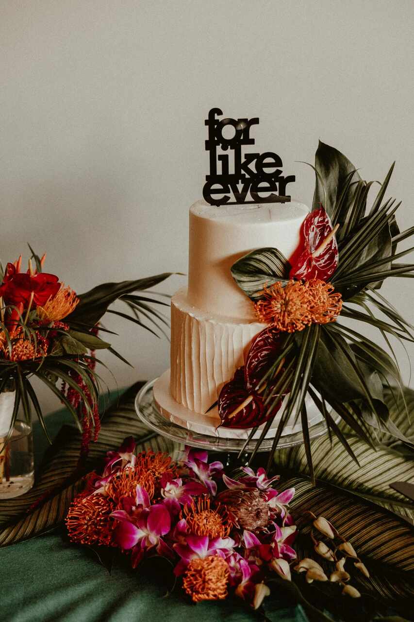 A escolha do bolo em um casamento tropical não segue regras rígidas. Ele pode ser tanto uma peça mais minimalista quanto uma proposta mais chamativa com muitas cores e elementos. Inspirados na natureza, eles podem incorporar texturas, além de cores que vão do branco clássico a tons quentes como coral, amarelo e verde, laranja. Decorações com flores tropicais, frutas frescas, folhagens são muito comuns.