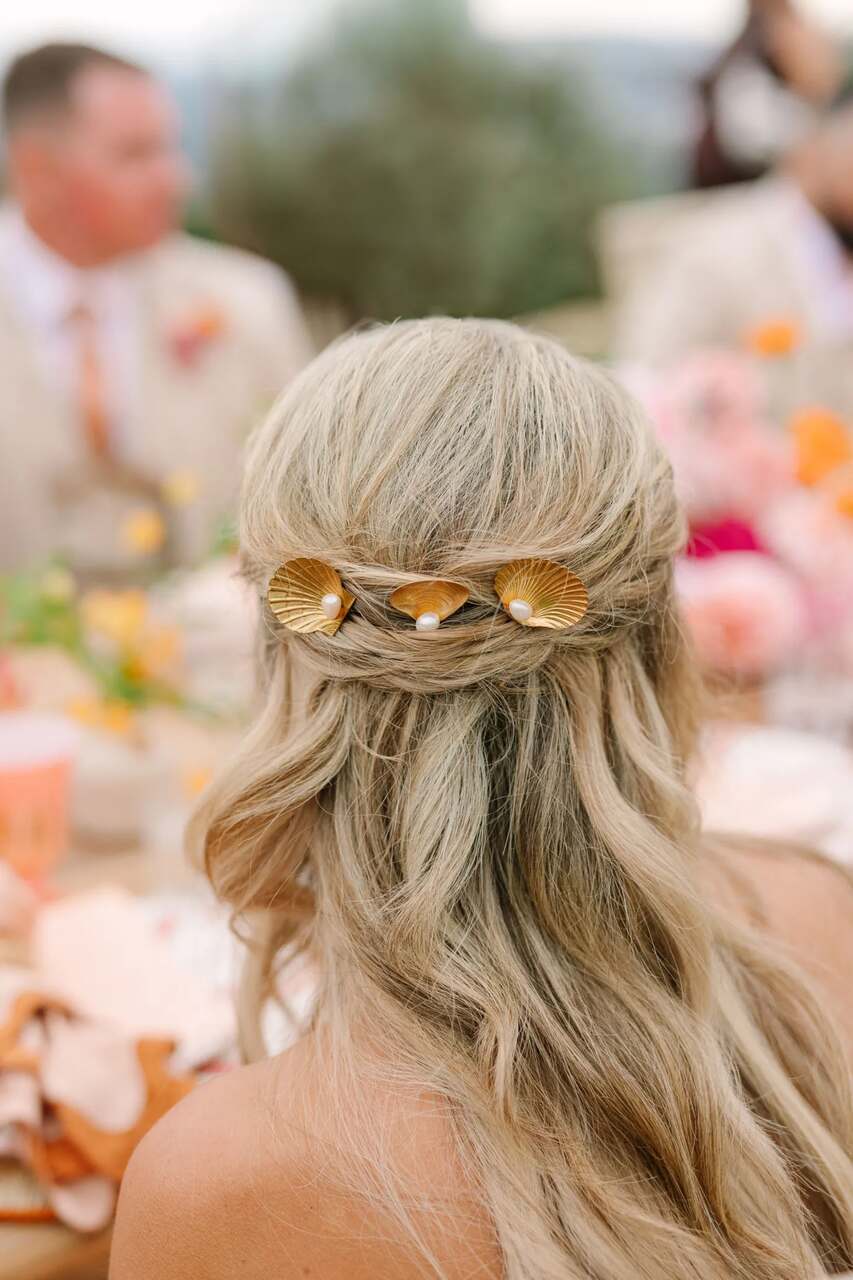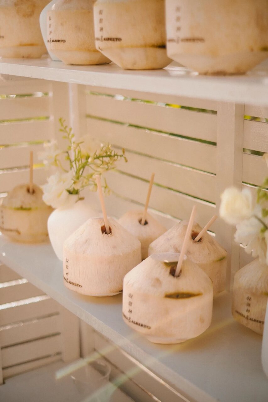 Além disso, se o casamento é com o pé na areia, detalhes como conchas, estrelas-do-mar, cocos e até pequenas jangadas podem ser usados para dar um toque especial e reforçar o tema tropical.