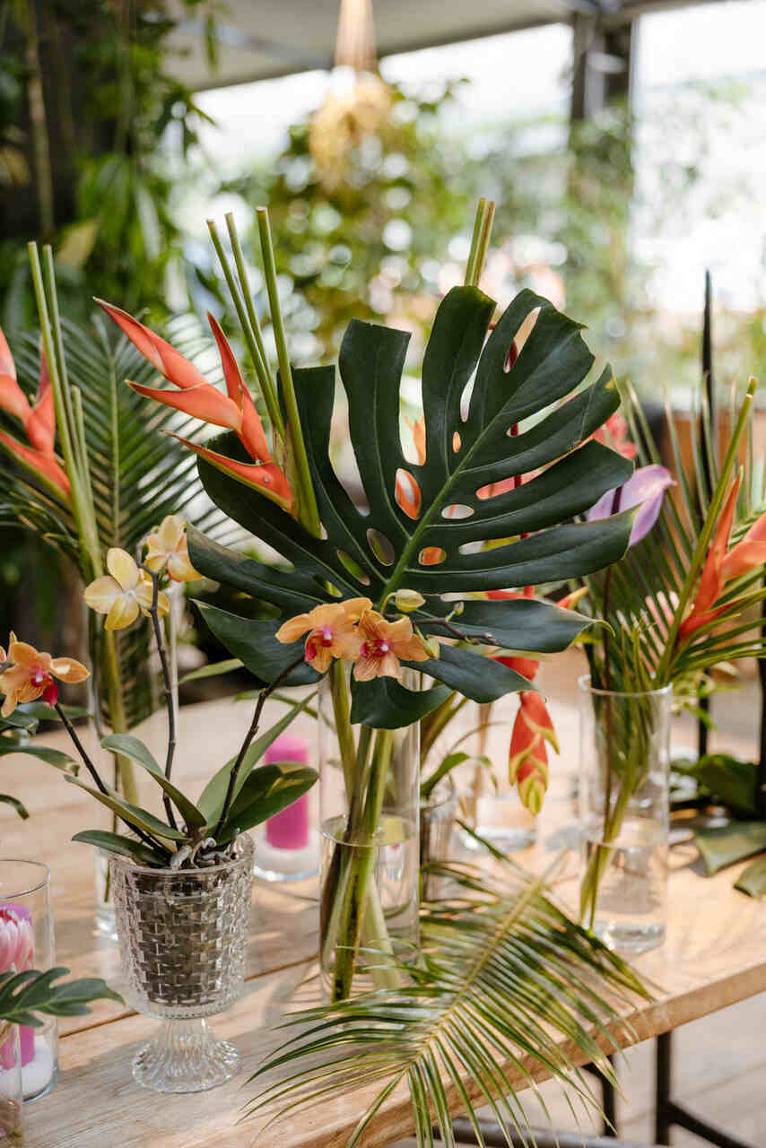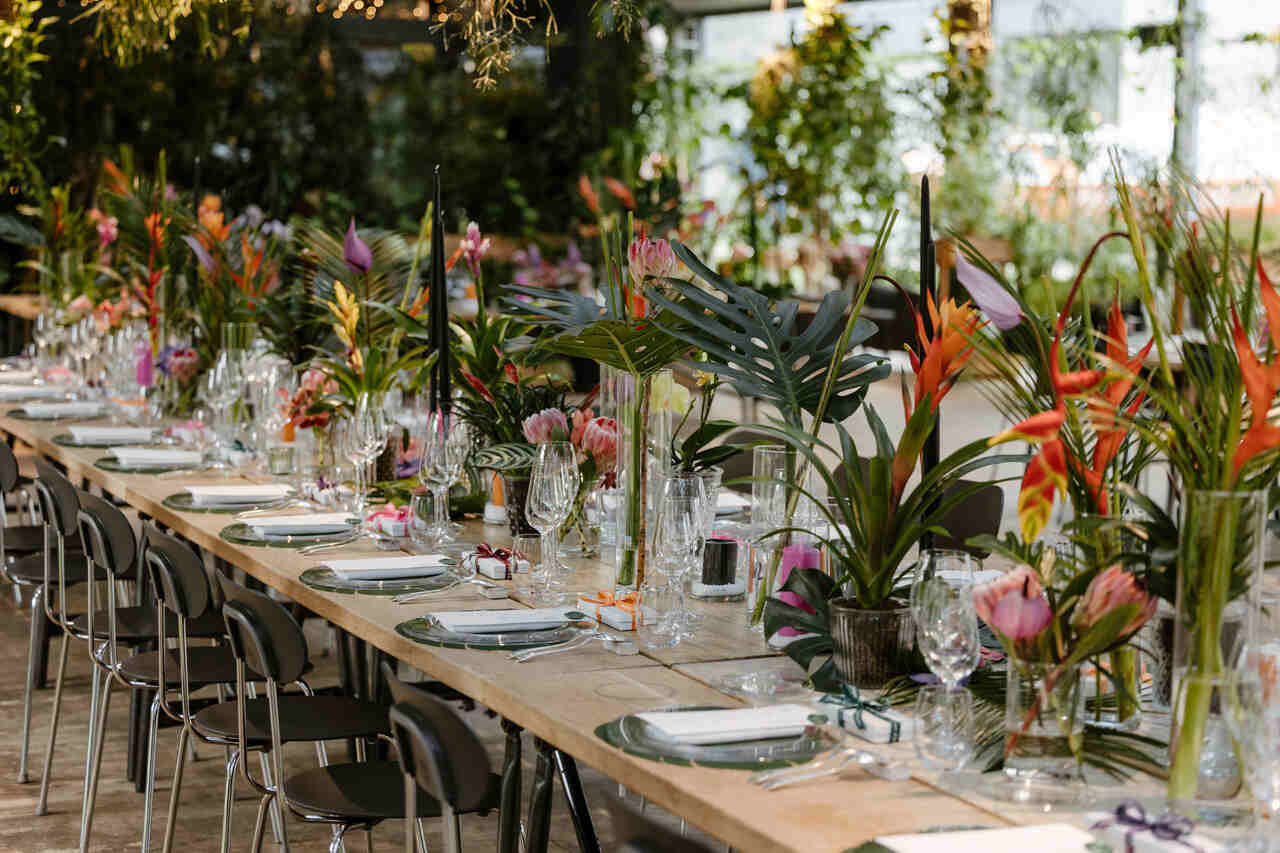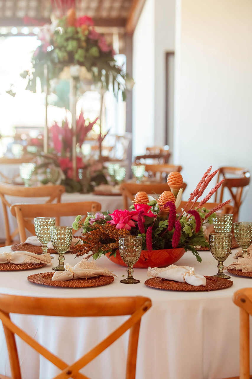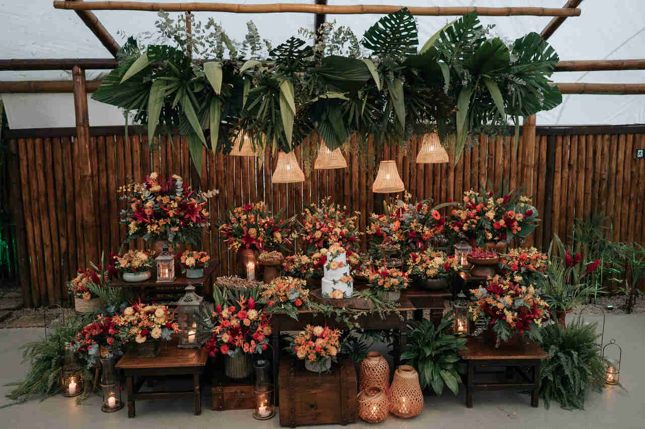Para um casamento tropical, a decoração faz toda a diferença e é um espetáculo à parte! O estilo fica, principalmente, por conta dos arranjos florais exuberantes que trazem vida e cor ao ambiente, além dos elementos decorativos naturais como folhas tropicais, sousplats de palha e frutas frescas, por exemplo.