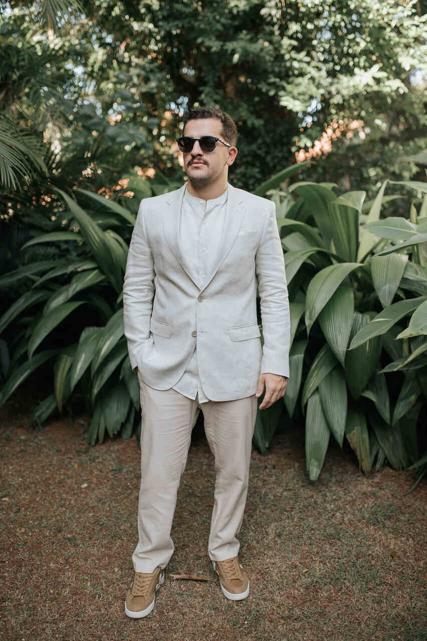 Já os convidados têm liberdade para apostar em roupas confortáveis, como vestidos estampados, camisas florais ou até peças de algodão e linho, mantendo a elegância e o frescor que o ambiente pede.
