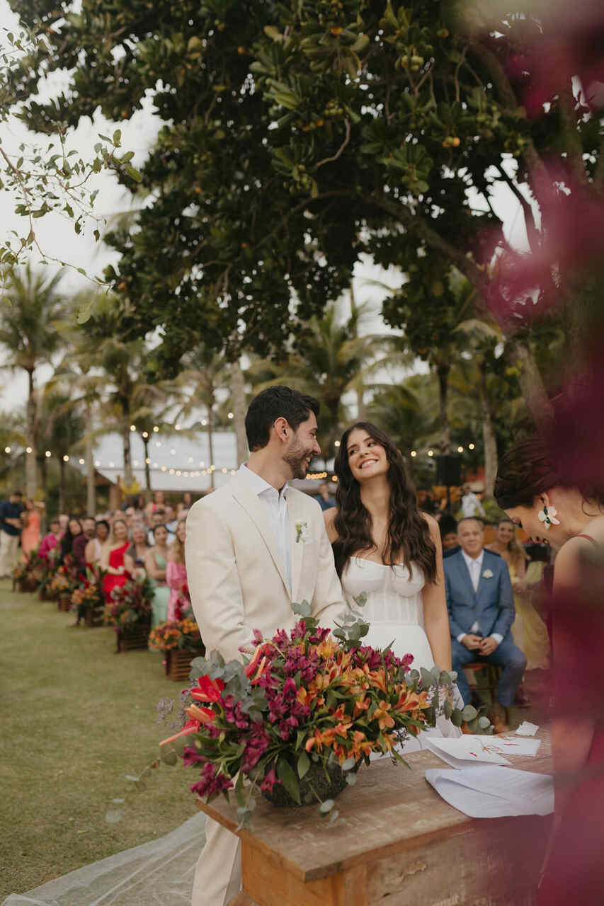Dica do Lápis: A escolha da estação do ano faz toda a diferença para quem quer incorporar o casamento tropical por completo. O clima quente do verão é uma ótima escolha. Analise com cuidado a data escolhida, evitando épocas de chuvas intensas.