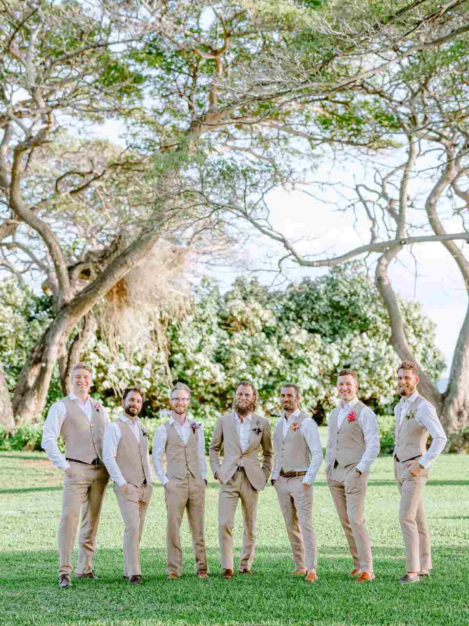 Um casamento tropical pede leveza. Para os trajes, os noivos podem apostar em tecidos como linho e algodão em cores claras, enquanto vestidos de noiva fluidos com detalhes florais ou cortes mais descontraídos são ótimas sugestões para aquelas que desejam um visual elegante, mas alinhado ao tema tropical.