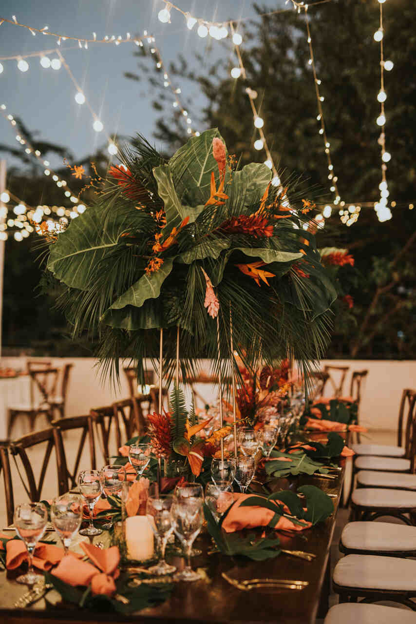Voltar para o índicePara um casamento tropical, a decoração faz toda a diferença e é um espetáculo à parte! O estilo fica, principalmente, por conta dos arranjos florais exuberantes que trazem vida e cor ao ambiente, além dos elementos decorativos naturais como folhas tropicais, sousplats de palha e frutas frescas, por exemplo.