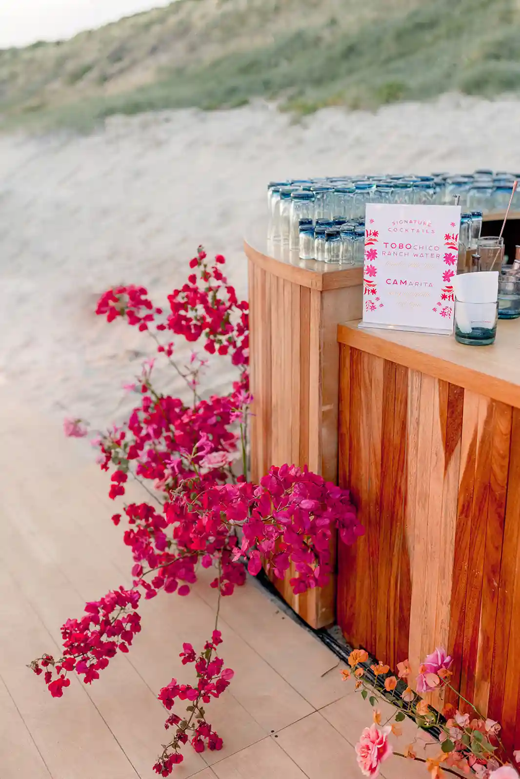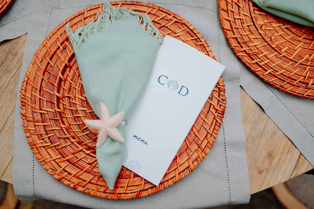 Além disso, se o casamento é com o pé na areia, detalhes como conchas, estrelas-do-mar, cocos e até pequenas jangadas podem ser usados para dar um toque especial e reforçar o tema tropical.
