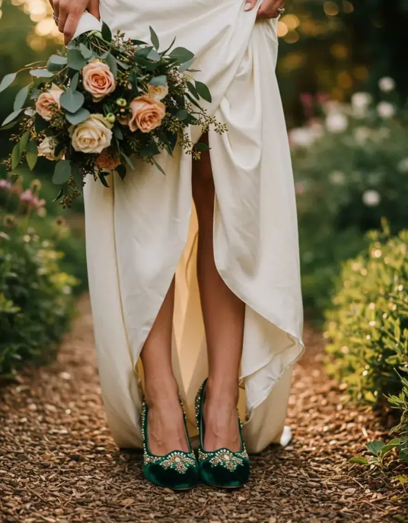 Sapatos de noiva verde esmeralda trazem um toque sofisticado e cheio de personalidade para o look do grande dia.