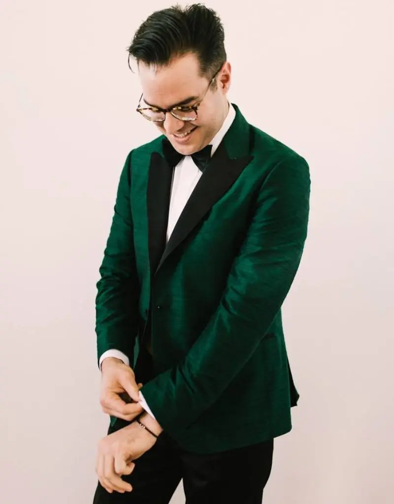 O verde esmeralda também pode aparecer no traje masculino e isso faz toda a diferença na composição final.