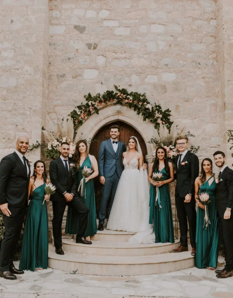 Os vestidos de madrinhas em verde esmeralda são uma escolha elegante e extremamente fotogênica.