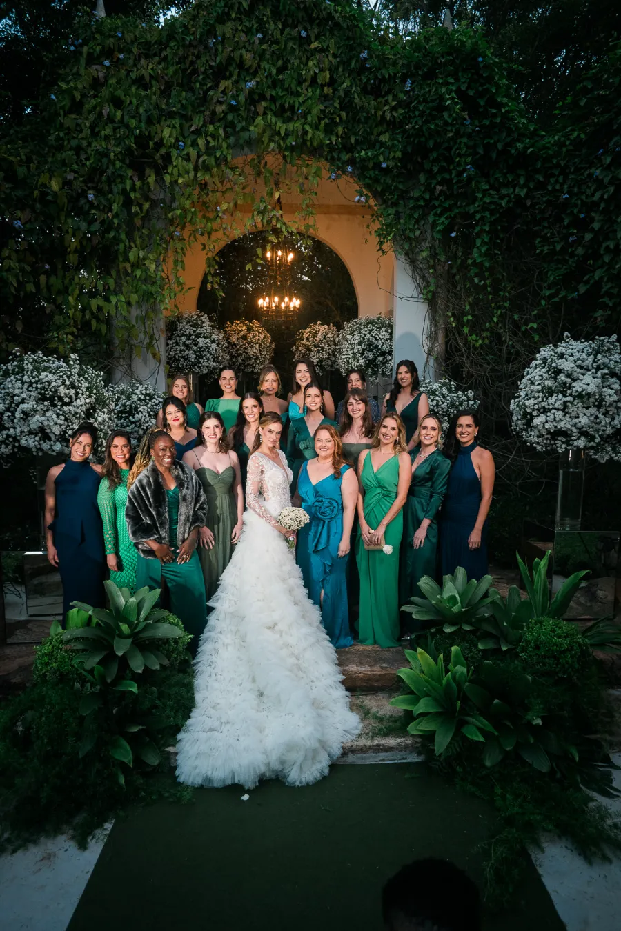- Trajes: noivos e madrinhas em verde petróleo