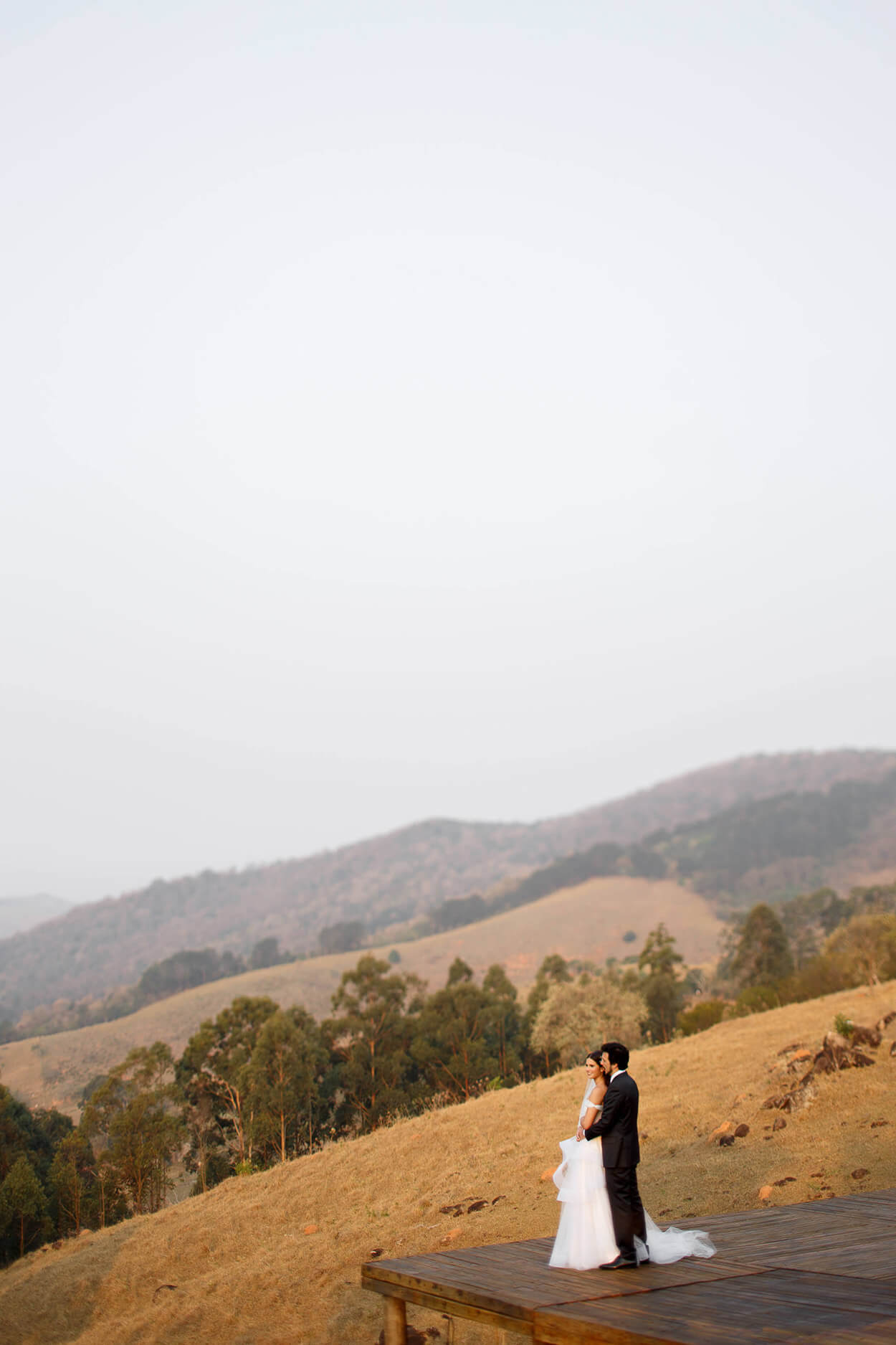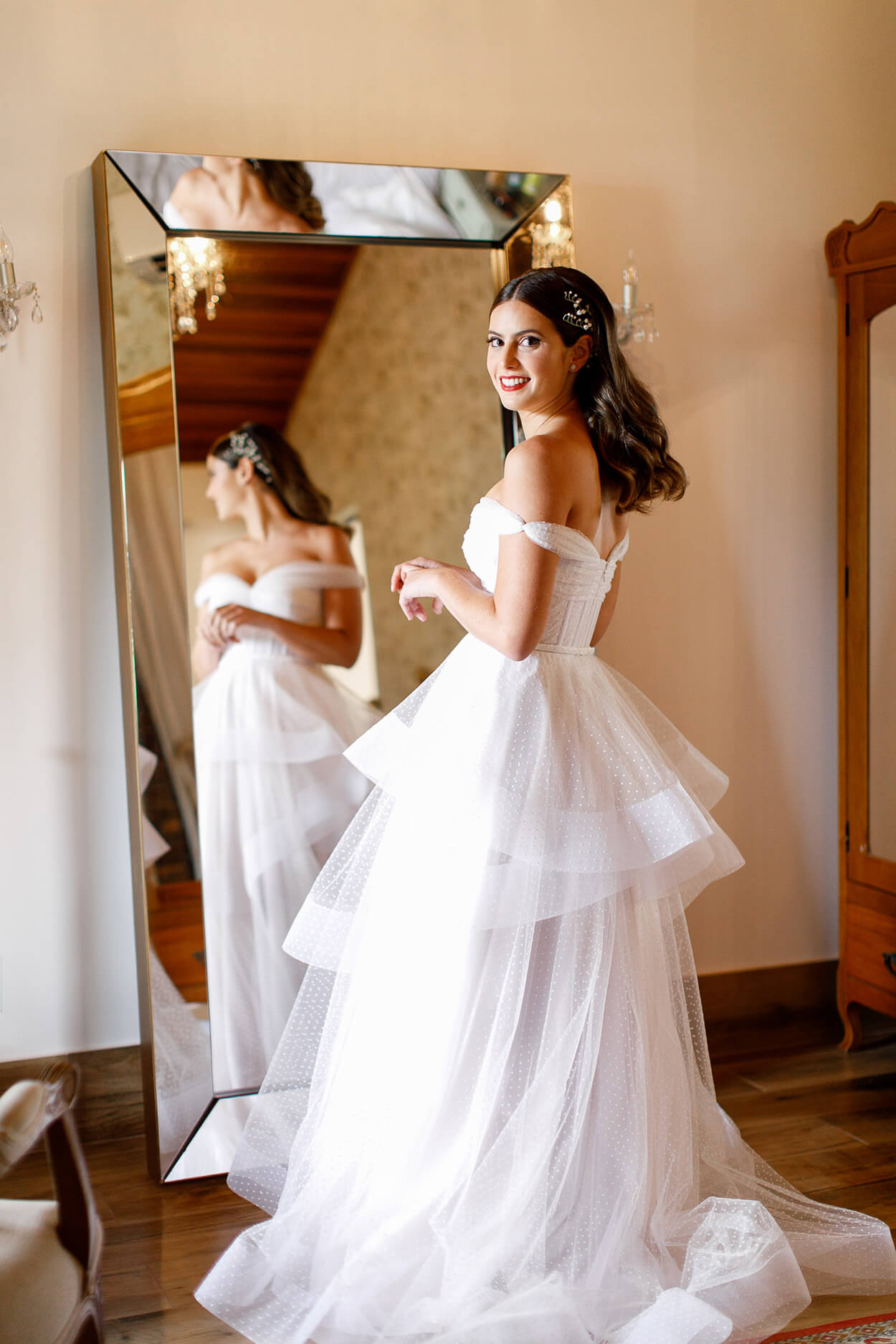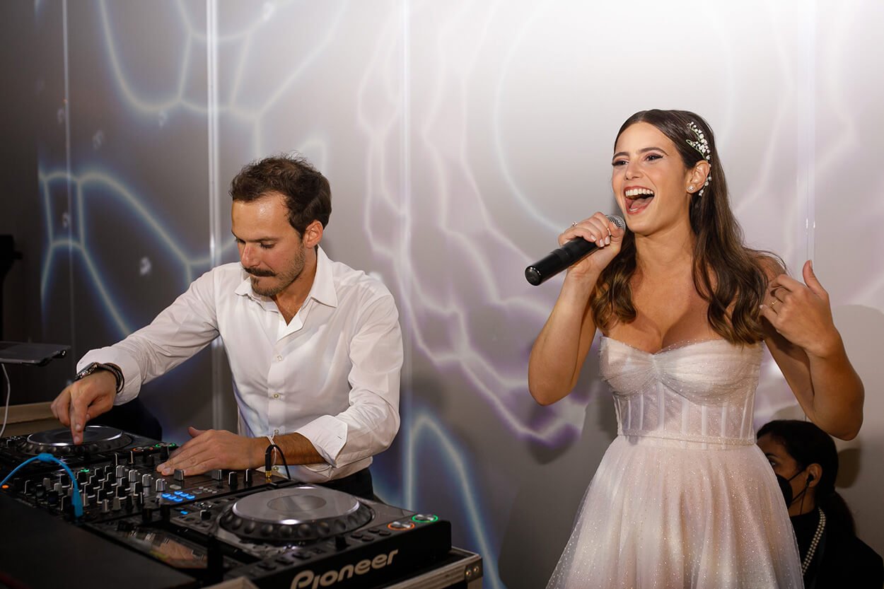 Se tivéssemos que definir o vestido da Raquel em uma palavra, ela seria: esvoaçante! O modelo consegue transmitir um estilo mais elegante e sofisticado mesmo com os cortes volumosos de tule. Já na parte do busto, o corset e as mangas no ombro dão um toque de princesa a produção.