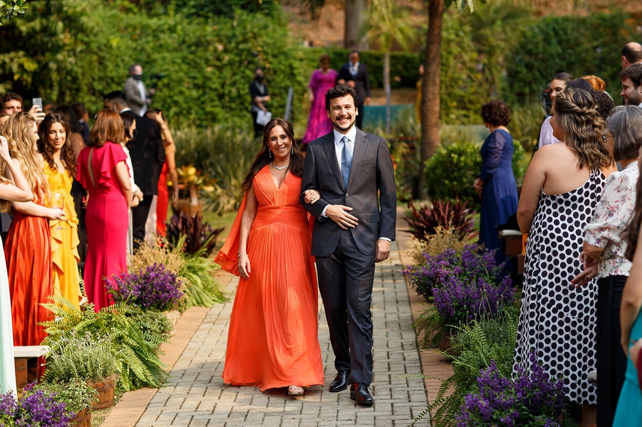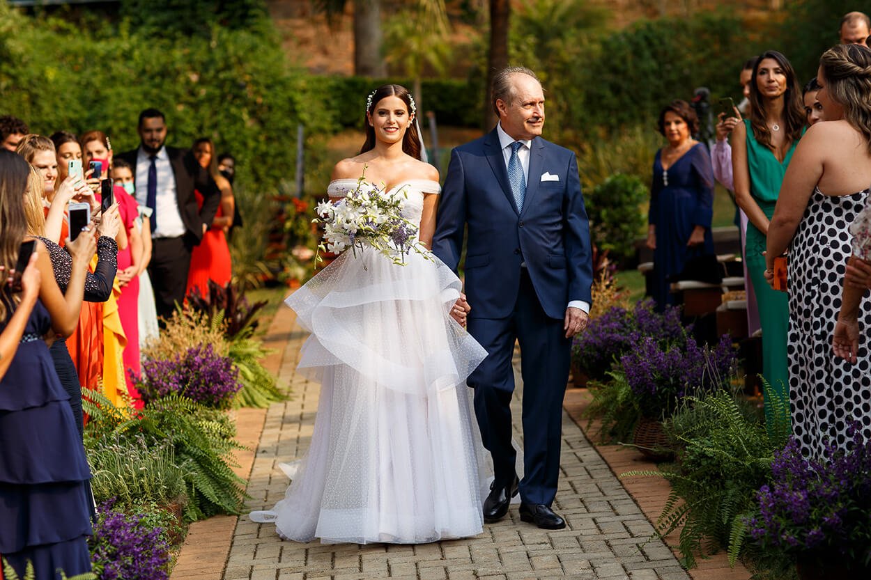 A decor ficou por conta dos arranjos florais de lavandas e folhagens. O fato de ser um casamento de frente para o lago e ainda ter convidados com cores marcantes trouxe um clima fresco à cerimônia.
