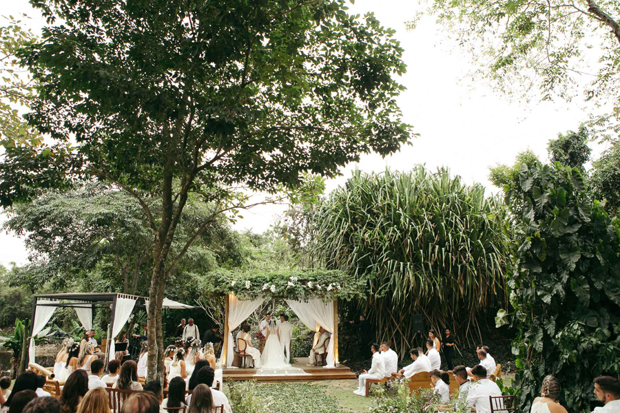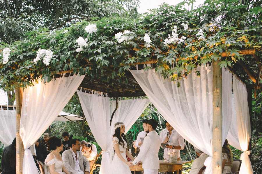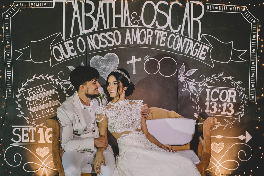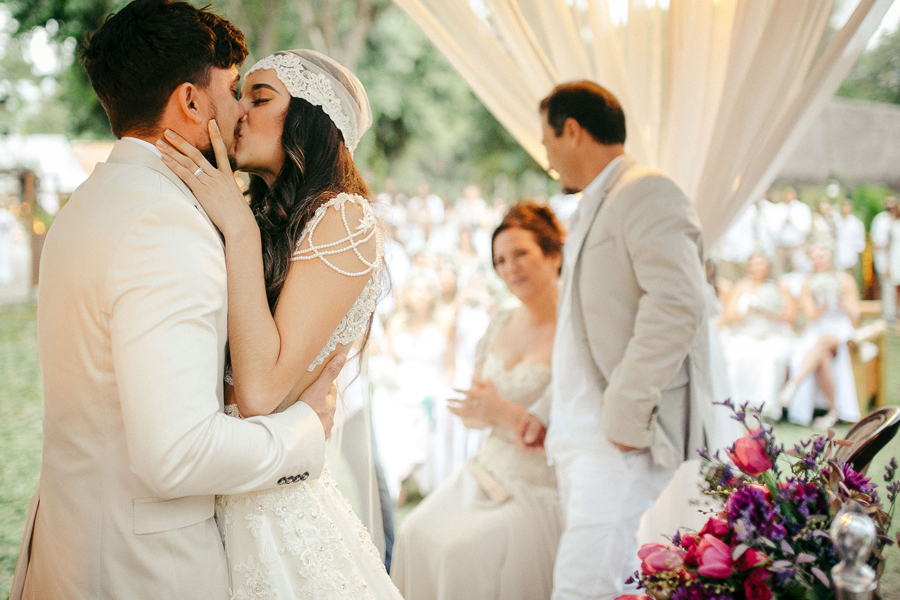 A Tabatha sonhava com um casamento de astral bem leve. Um dos seus pedidos especiais foi que todos os convidados e staff usassem branco no dia do casamento para criar um clima bem puro e harmonioso. A noiva que é estilista fez questão de compor o seu próprio look e ainda por cima surpreendeu a todos chegando de barquinho na cerimônia.