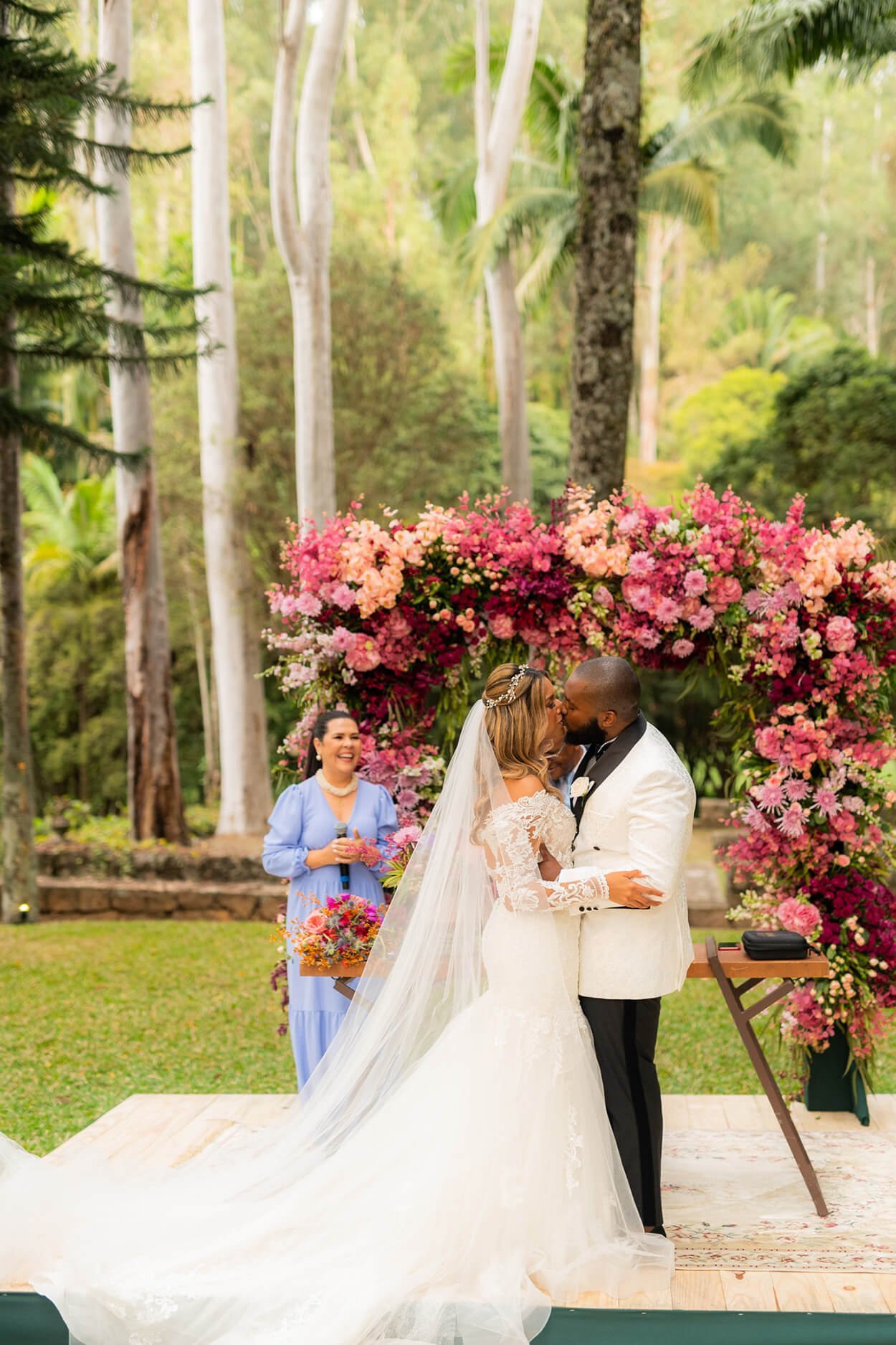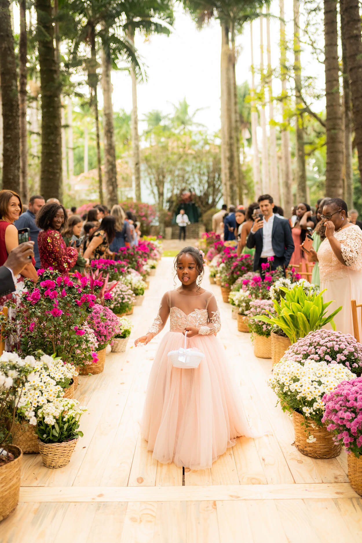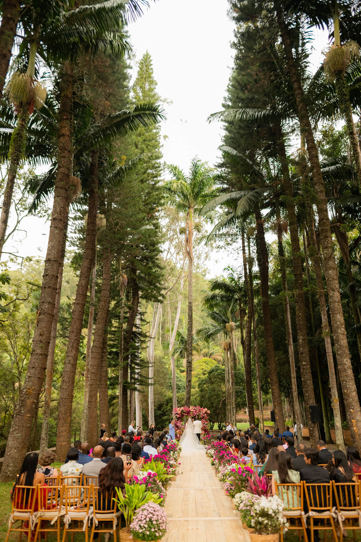 Uma das grandes apostas na decoração desse enlace é a aposta nos tons de rosa, inclusive rosa pink. Como a celebração aconteceu em meio a um bosque imponente com muitas palmeiras imperiais, as flores tiveram um papel importante criando um alto contraste para inspirar uma cerimônia bem romântica.