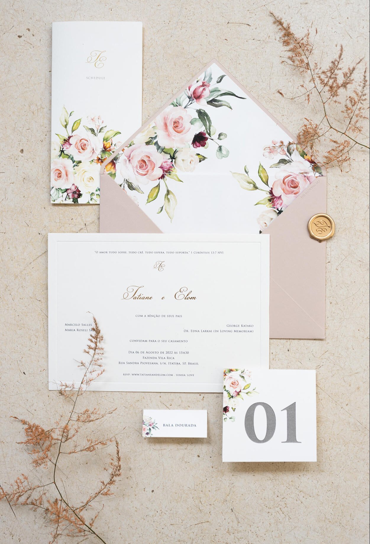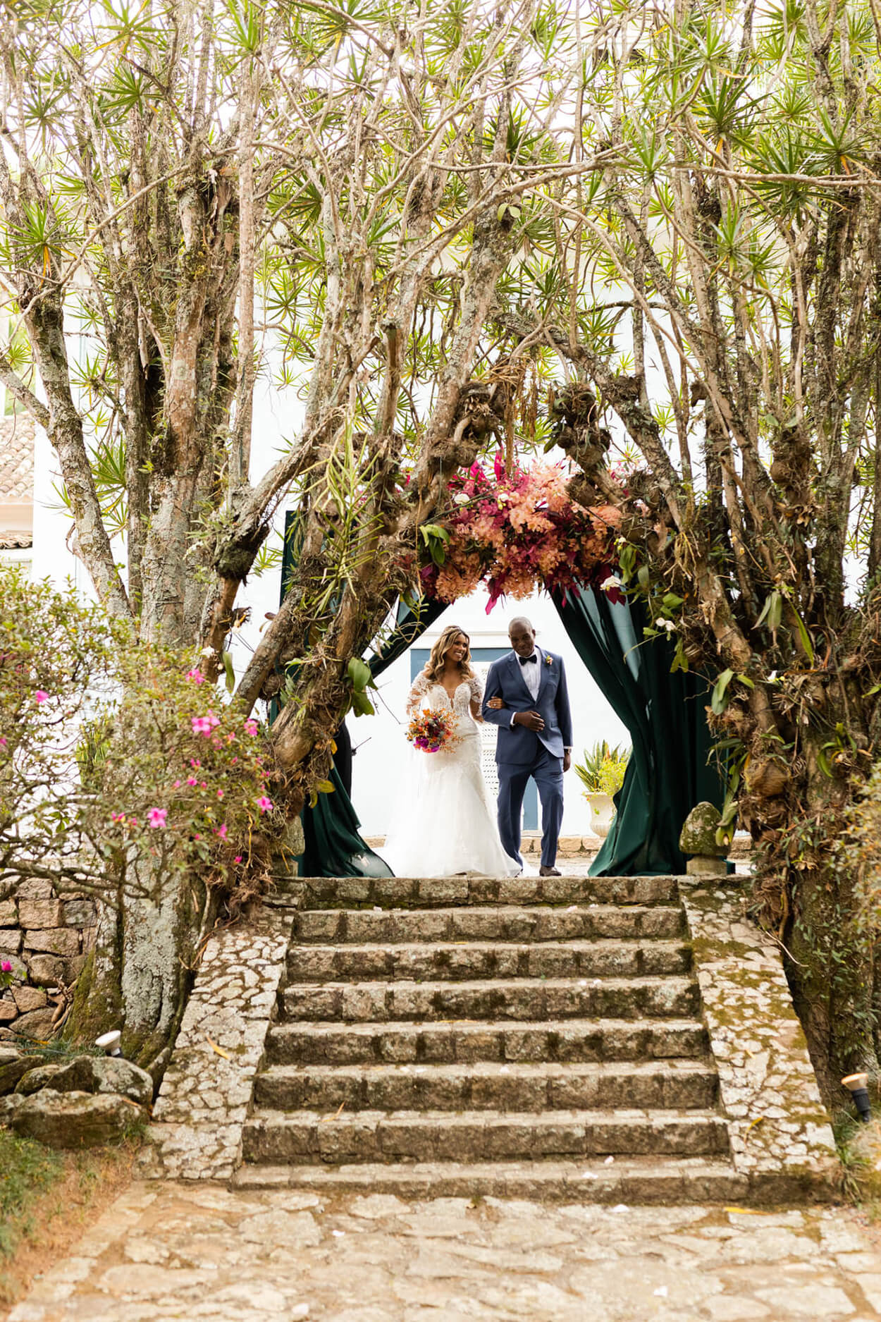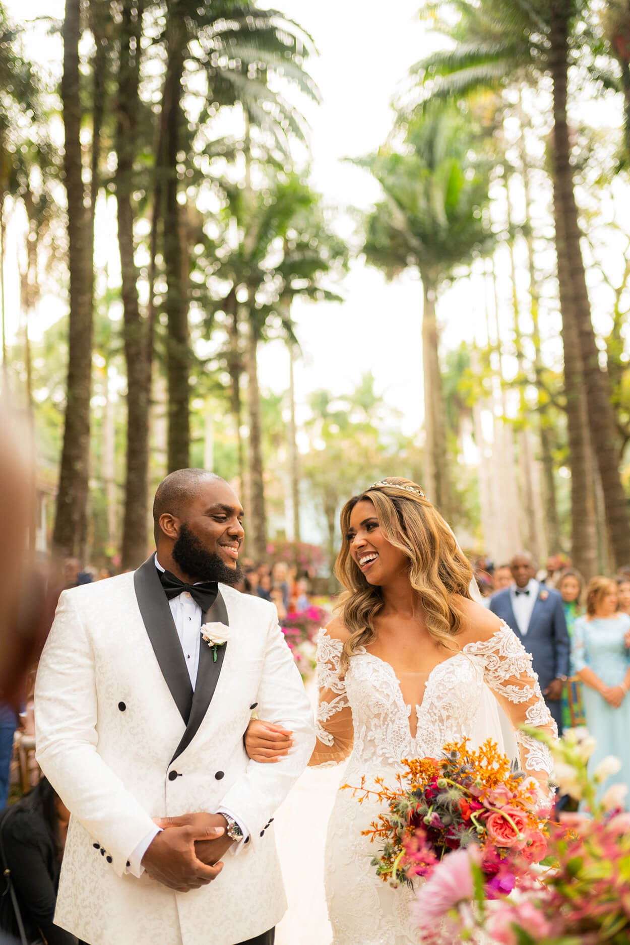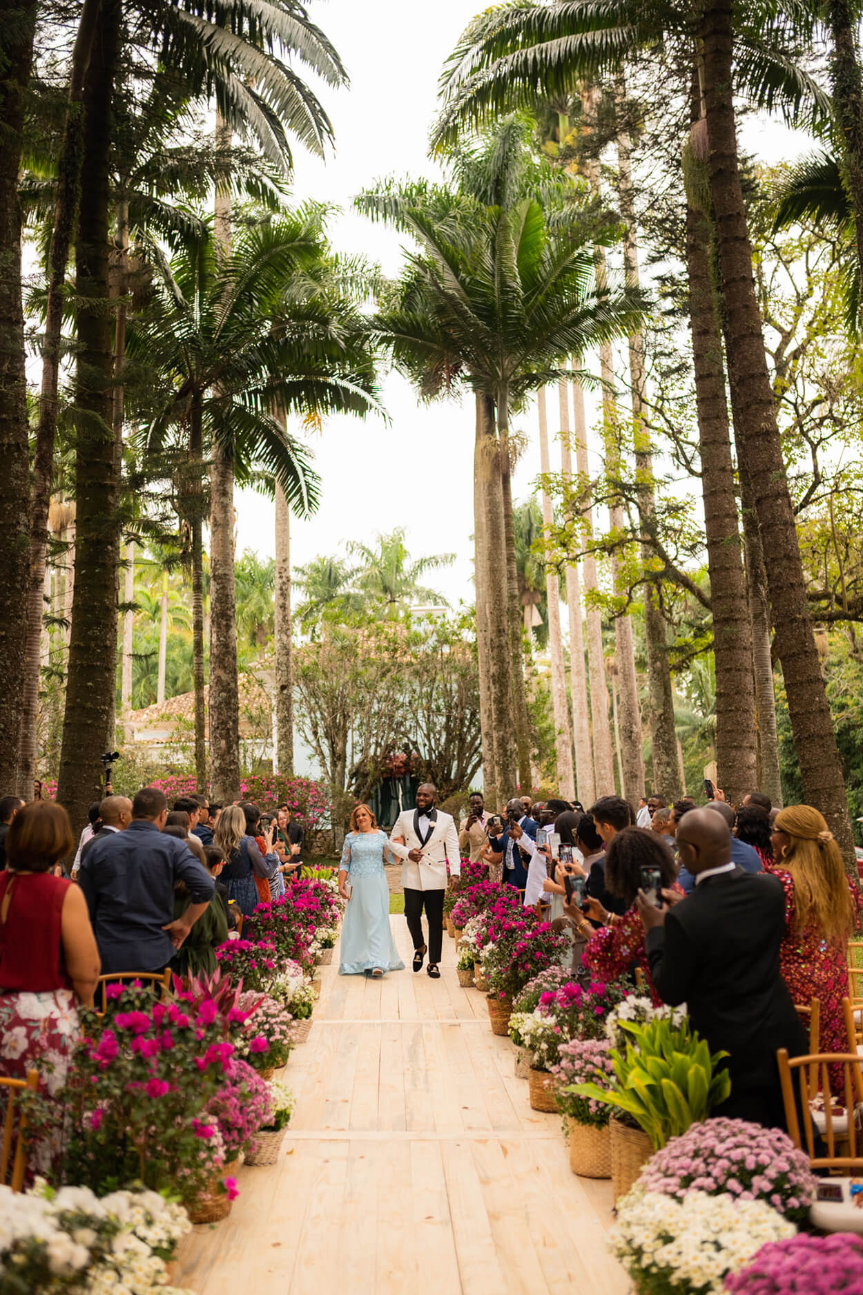 Uma das grandes apostas na decoração desse enlace é a aposta nos tons de rosa, inclusive rosa pink. Como a celebração aconteceu em meio a um bosque imponente com muitas palmeiras imperiais, as flores tiveram um papel importante criando um alto contraste para inspirar uma cerimônia bem romântica.