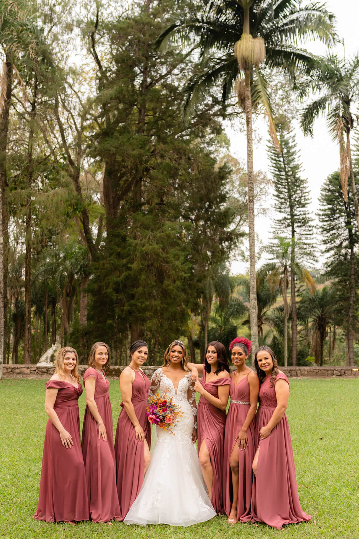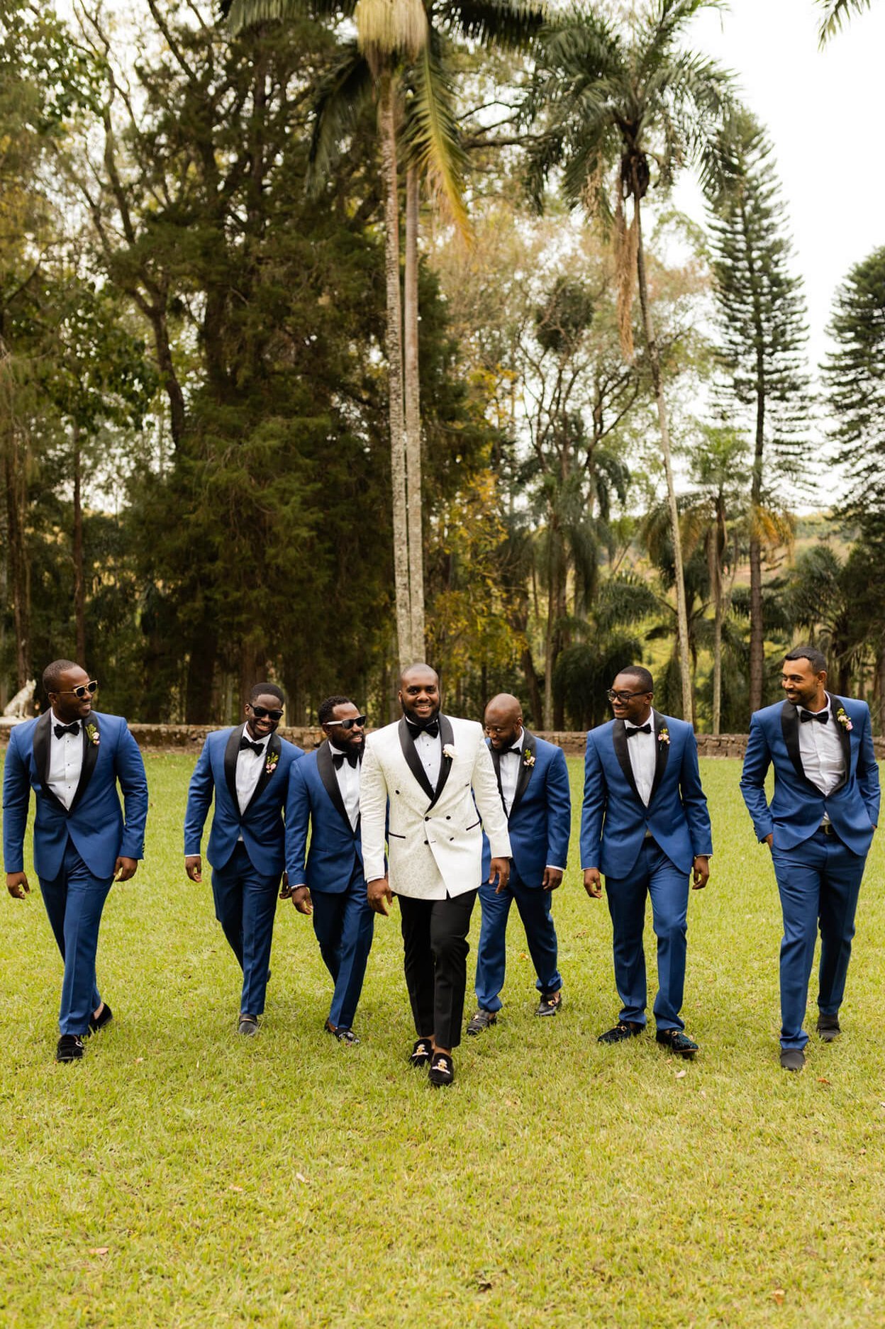 Seguindo a mesma paleta, as madrinhas usaram vestidos na cor rosa antigo. Já os padrinhos nos surpreenderam ao também usar smoking, só que em um azul cobalto, cheio de energia.