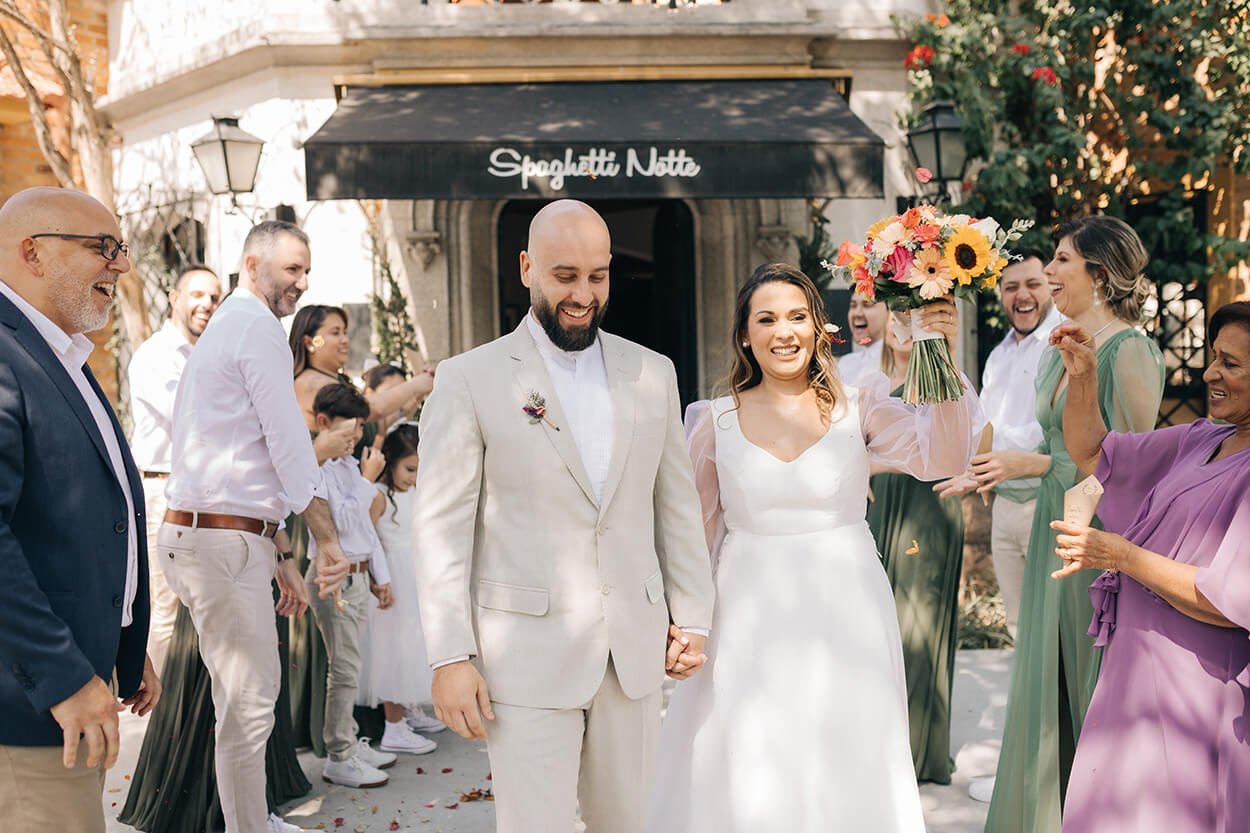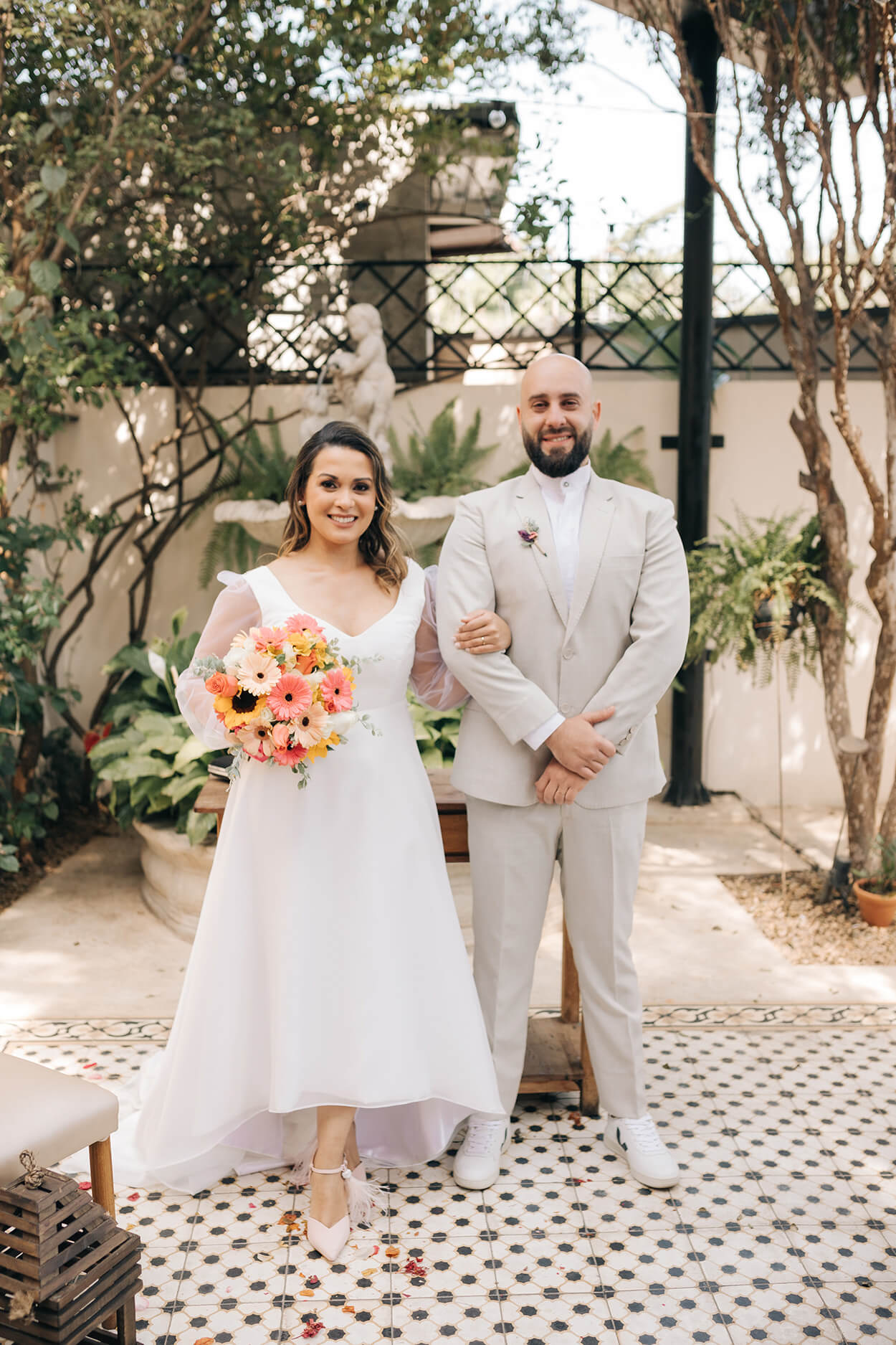O buquê todo colorido adicionou uma pegada divertida a produção da noiva. Aliás, o vestido foi uma ótima escolha, um modelo minimalista mas que também soube incorporar a informalidade das mangas bufantes. O noivo também aproveitou essa vibe e balanceou o look com um par de tênis casual.
