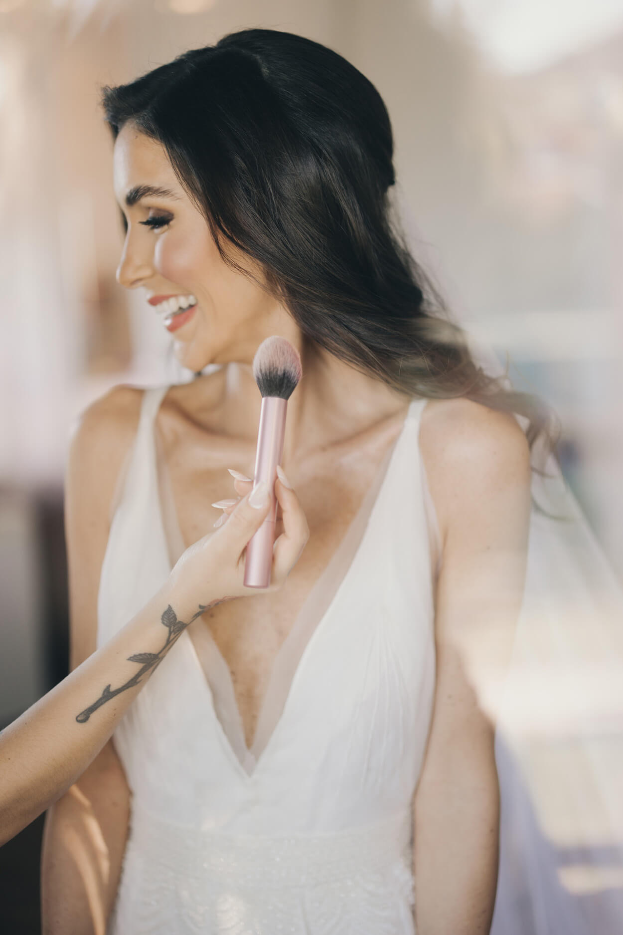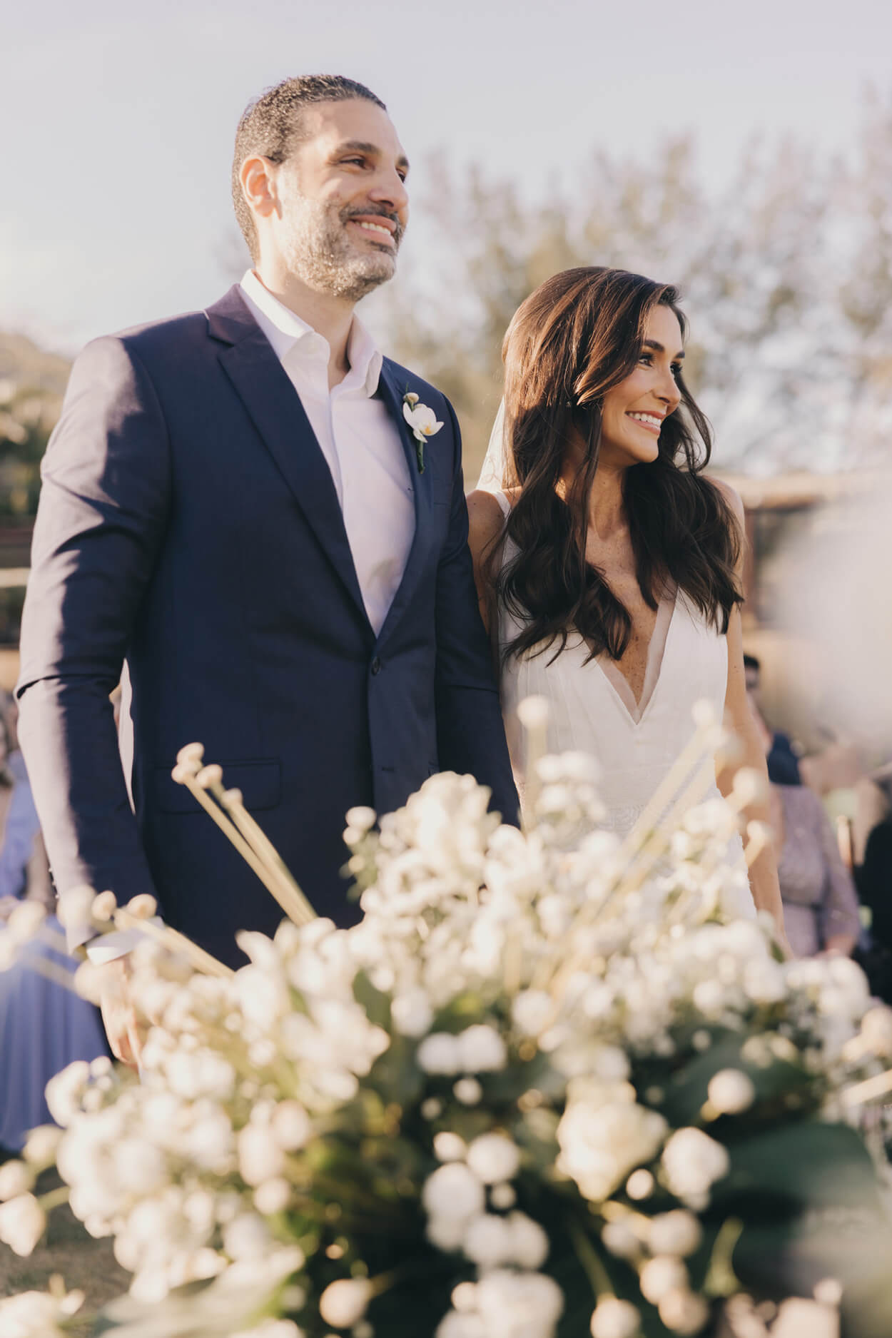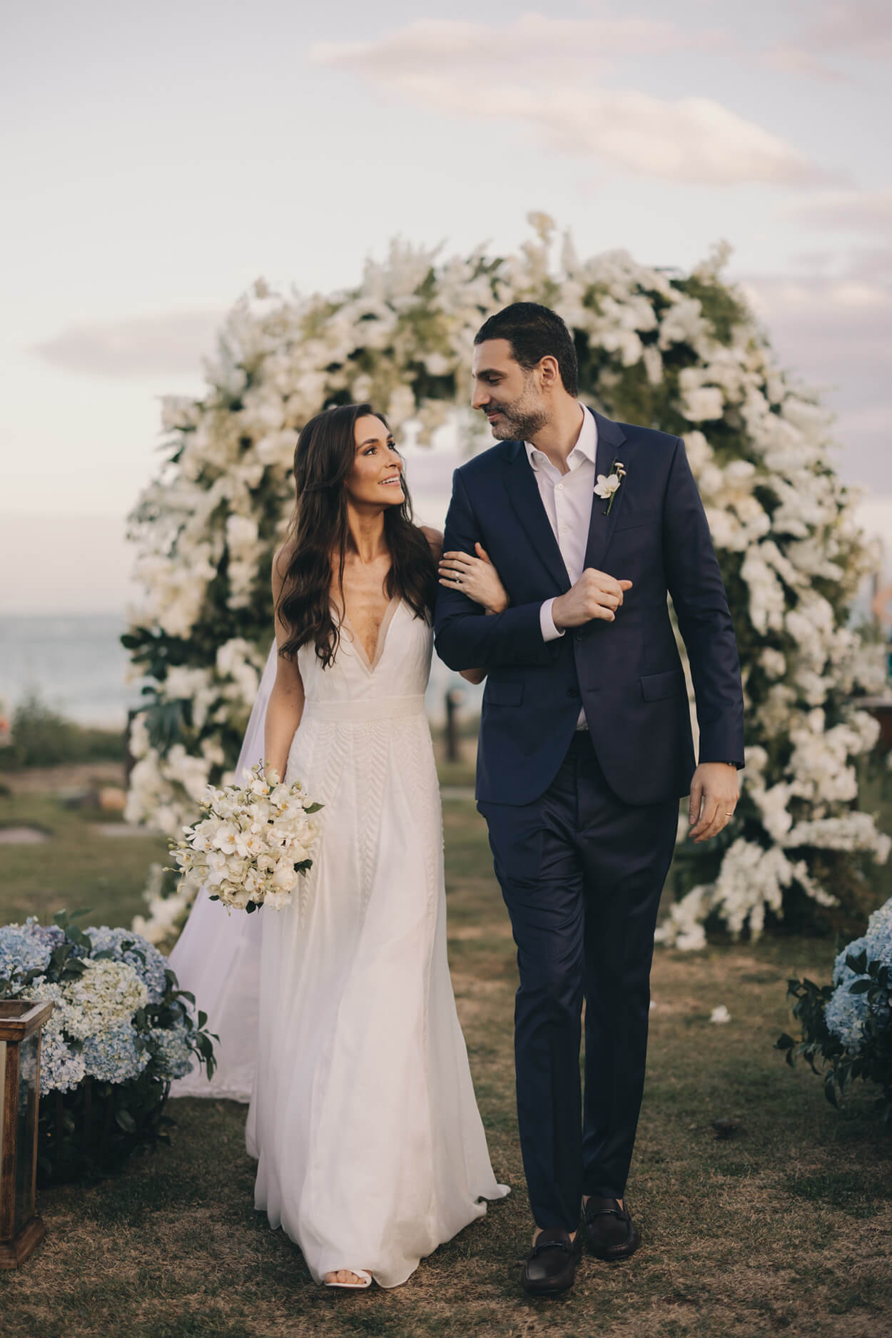 Agora falando sobre a beleza da noiva, ela buscou um visual mais informal e cheio de leveza. Por isso, escolheu o penteado semi preso finalizado com ondas. Por fim, a sombra carrega um certo brilho, mas, mesmo assim, cai muito bem tanto durante o dia quanto à noite.