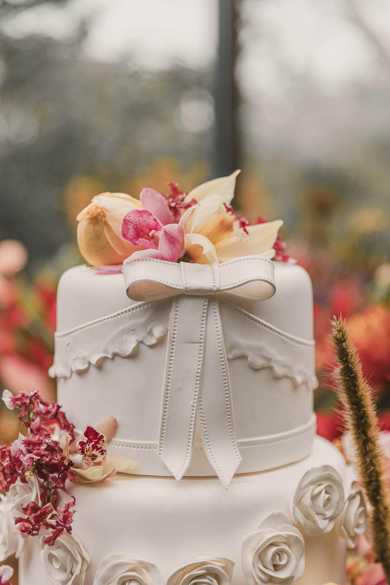 A mesa de bolo e doces é um show à parte, principalmente por conta da arranjo floral em formato de cascata. Em 2023, os bolos ganharam um refresh com tendências mais chamativas como a que vemos aqui: a ultra texturização. Impossível não amar esse lacinho!
