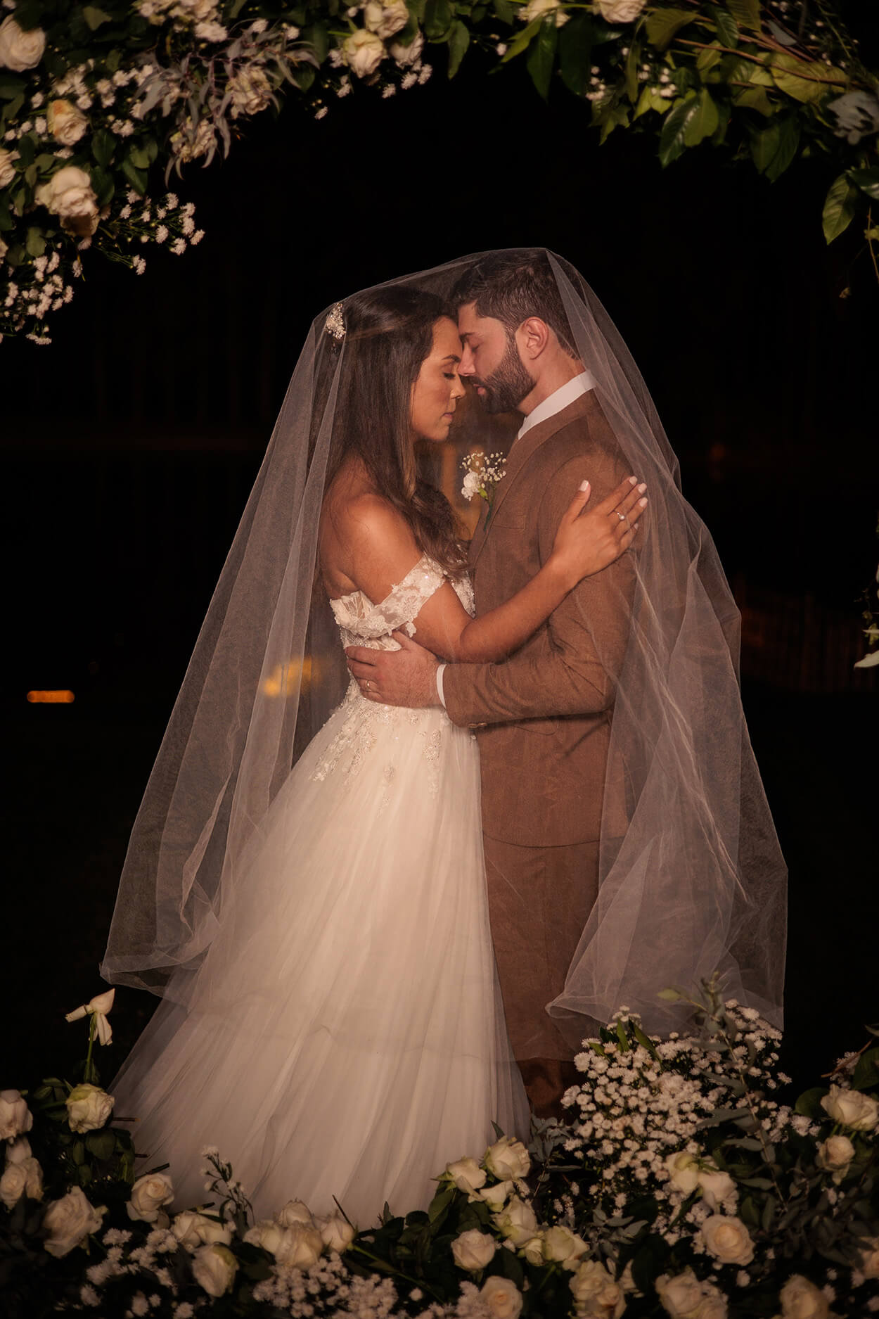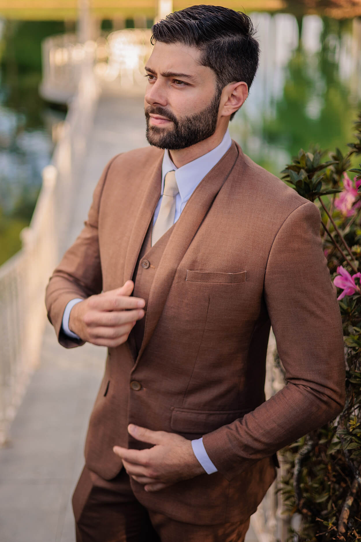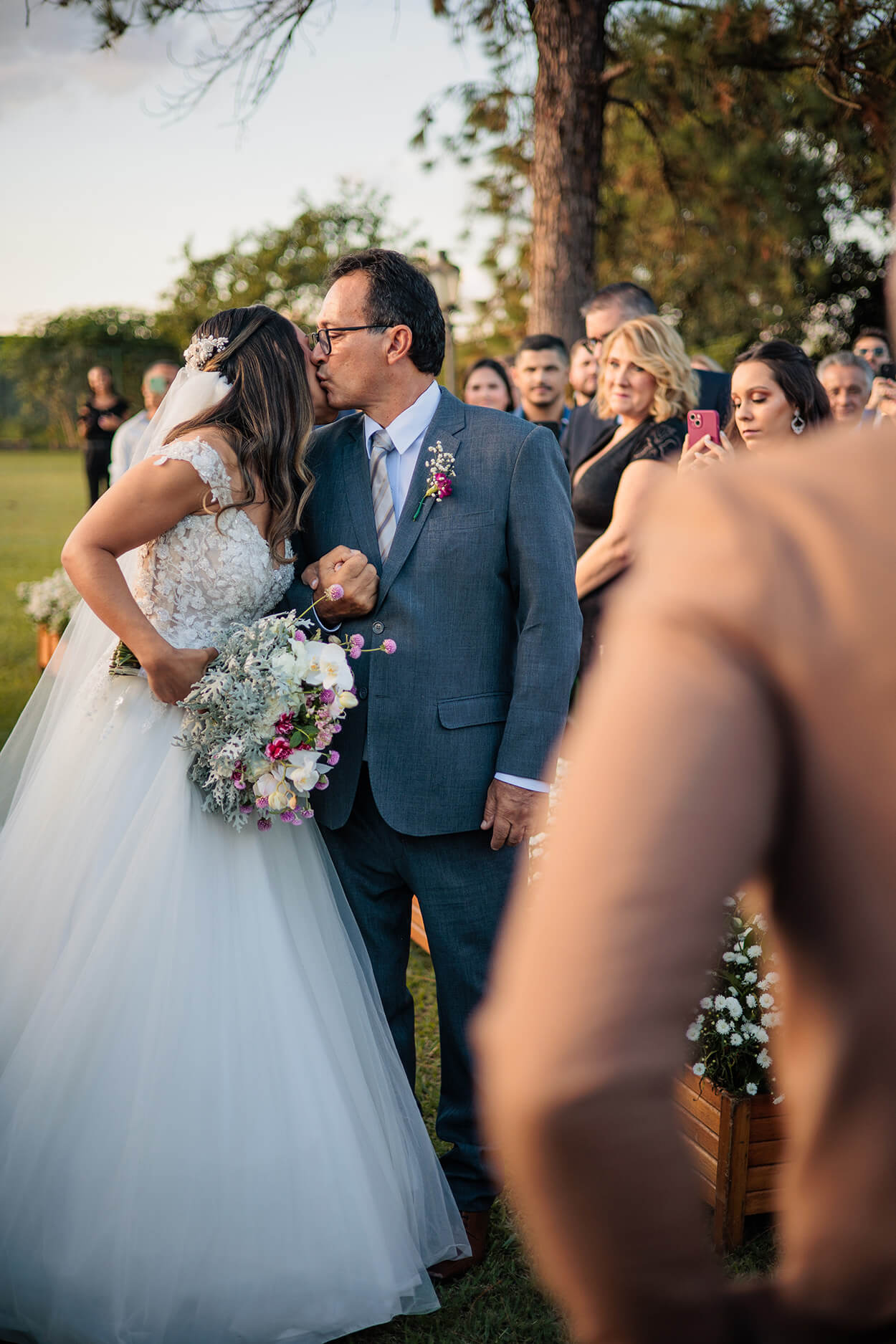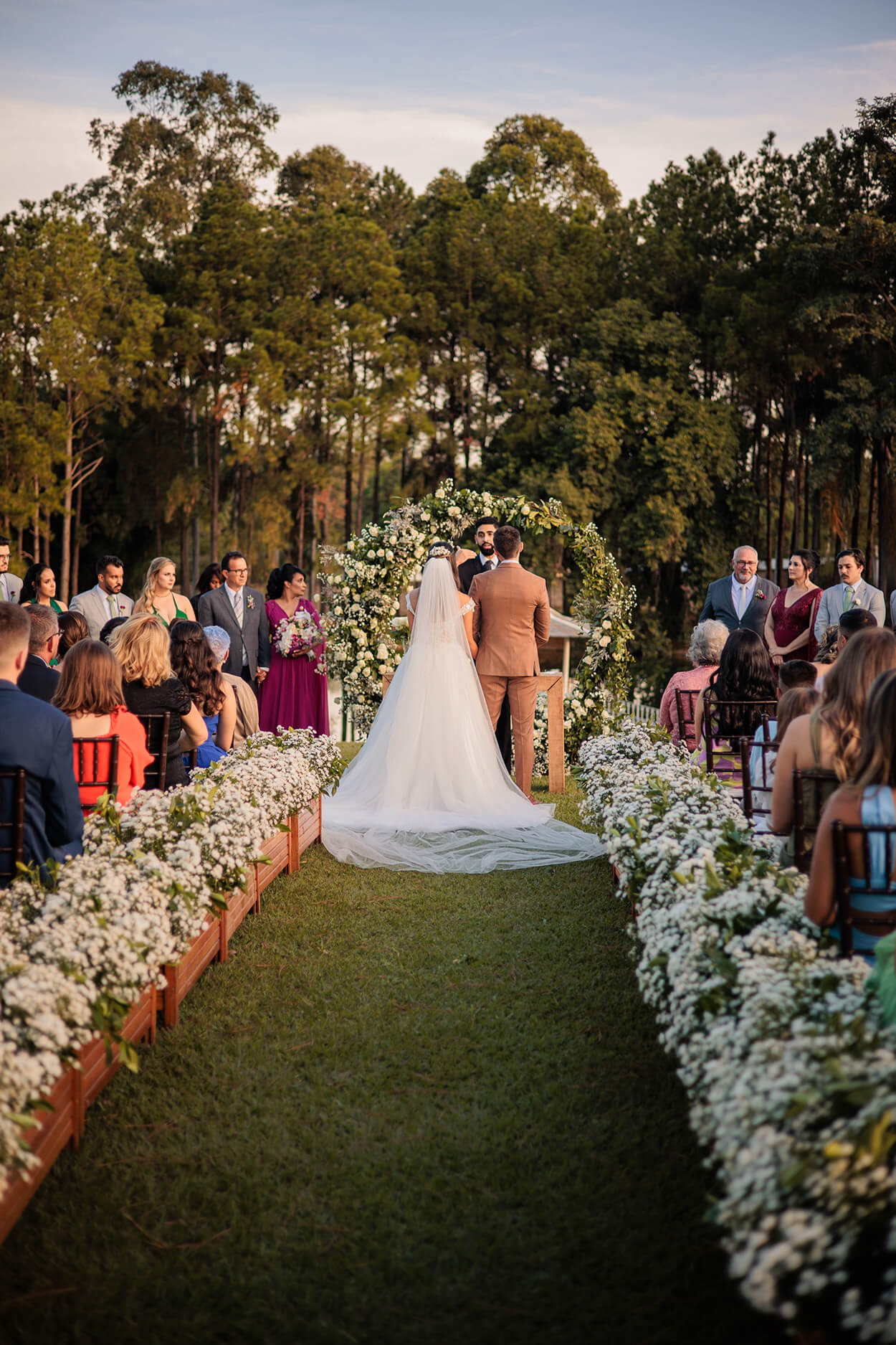 Antes de tudo, queremos chamar atenção para o traje do noivo. Já pensou em sugerir essa cor para o seu noivo? Sim, a tonalidade transmite uma postura mais clássica, além de que é perfeito para um casamento no campo com essa paleta de cores bem natural.