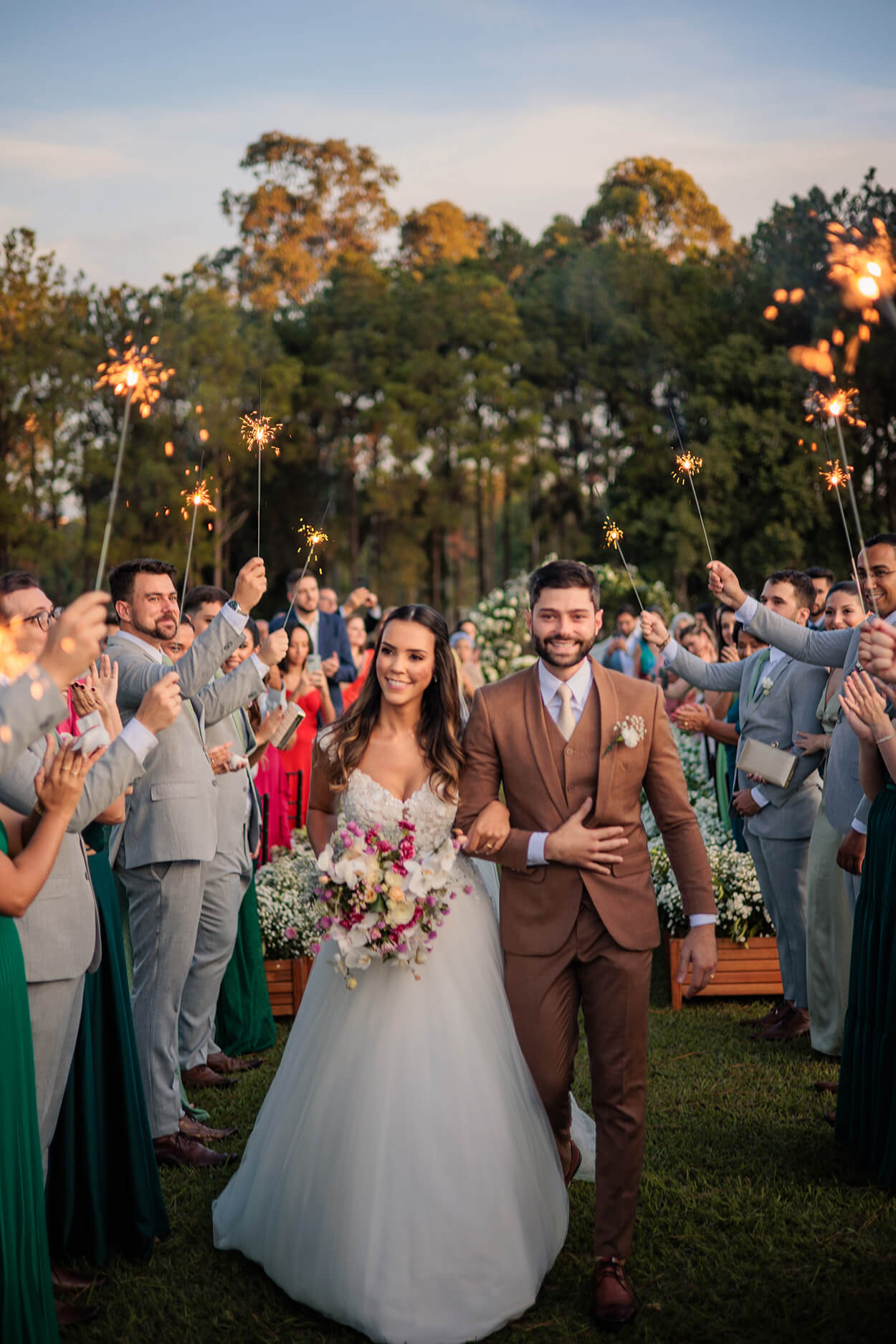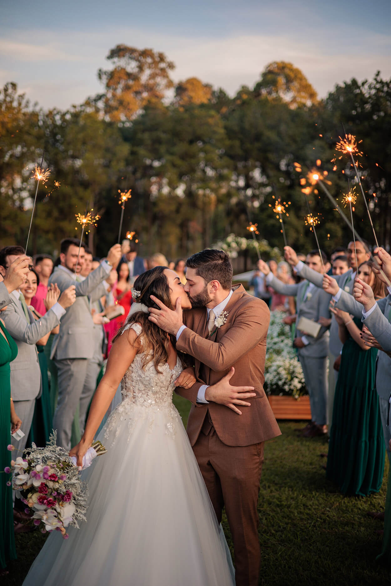 Se você pensa que os sparkles só ficam bonitos à noite, essa saída está aqui para provar o contrário! Mas ele não foi o único detalhe que roubou a cena. O buquê da Karol é simplesmente encantador, uma mistura de romantismo e criatividade. E, por fim, nós adoramos tanto a paleta quanto os modelos das madrinhas!