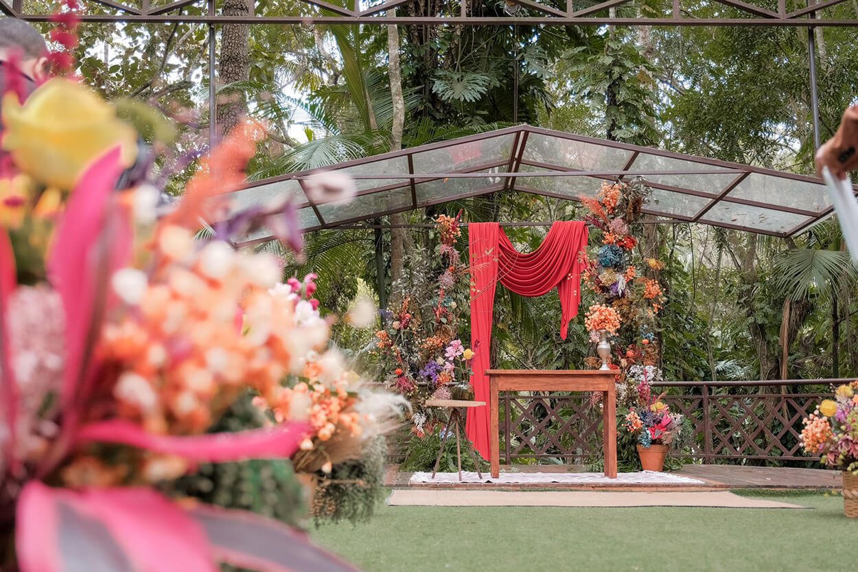 O casal fez questão de ter uma paleta colorida, misturando tons mais sóbrios como o vermelho com o alto astral do amarelo e a delicadeza do lilás. Mas isso só foi possível porque eles escolheram fornecedores que estavam interessado em conhecer a sua história e participar do grande dia.