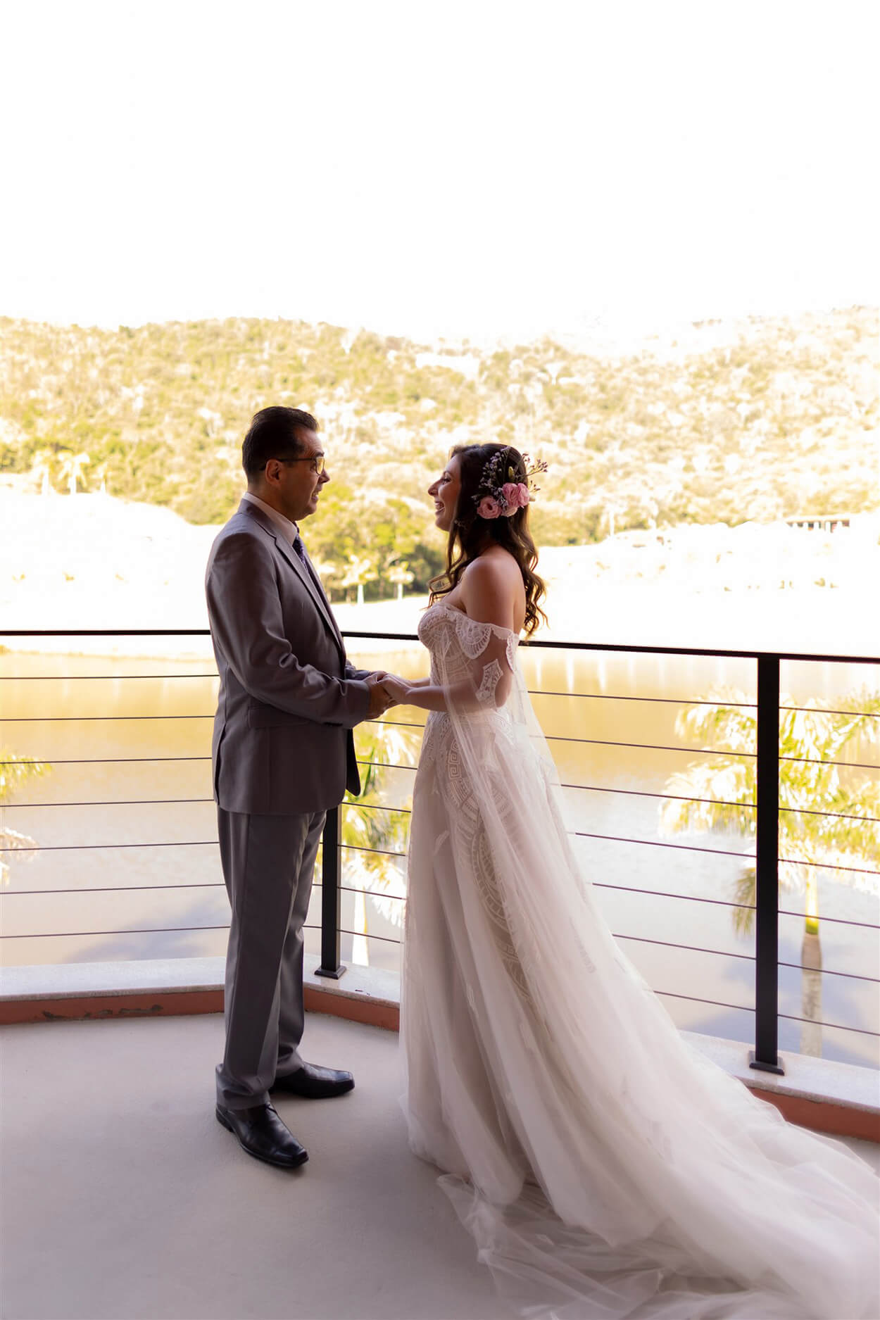 Noiva de mãos dadas com o seu pai na frente de casarão