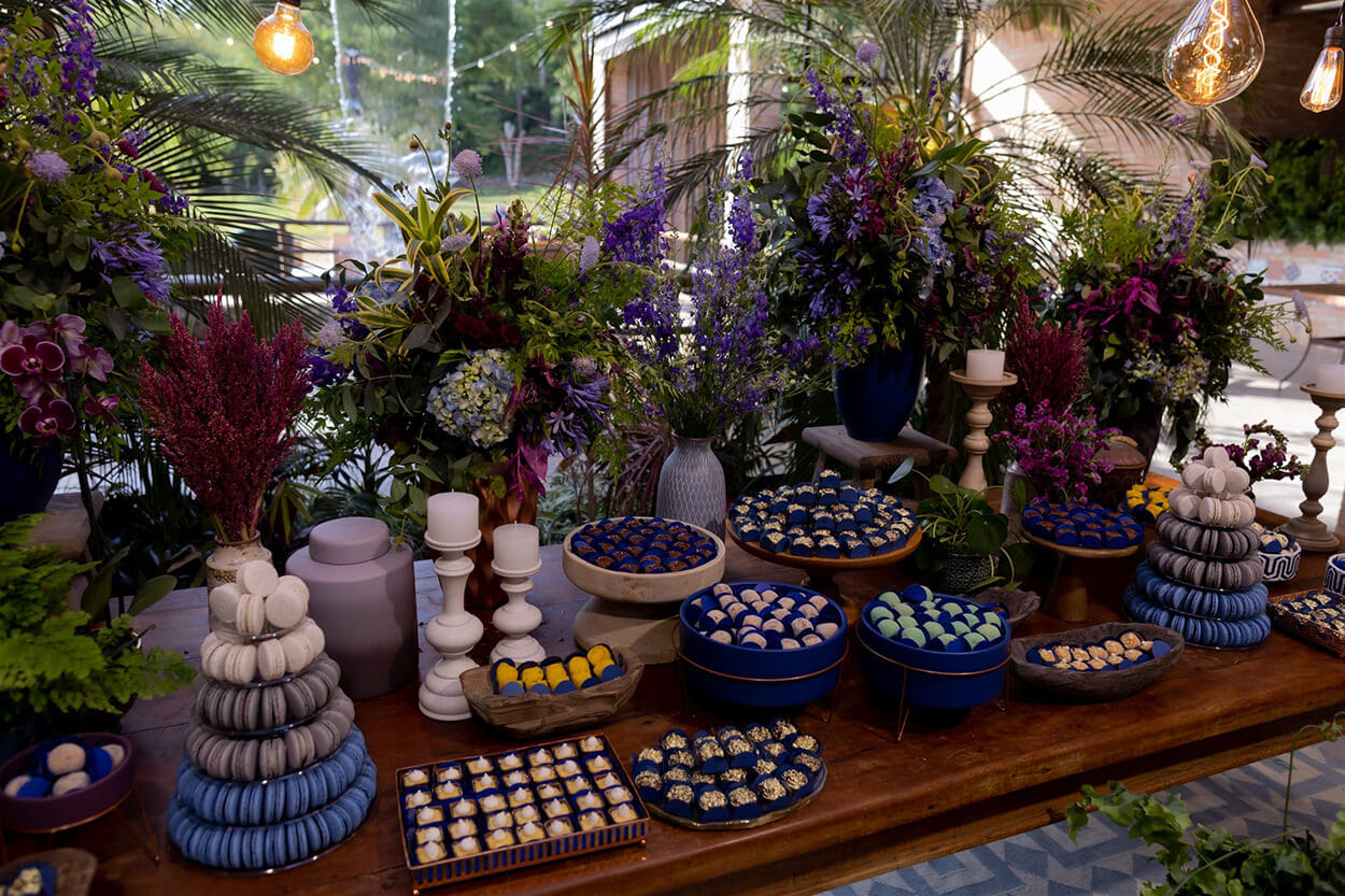 Com um casarão que se destaca pelo branco e azul, é natural que a paleta replique esse contraste na mesa de doces. Podemos perceber que a paleta brinca com as tonalidades de azul, roxo e ainda acrescenta um leve cor de rosa para deixar tudo mais leve.