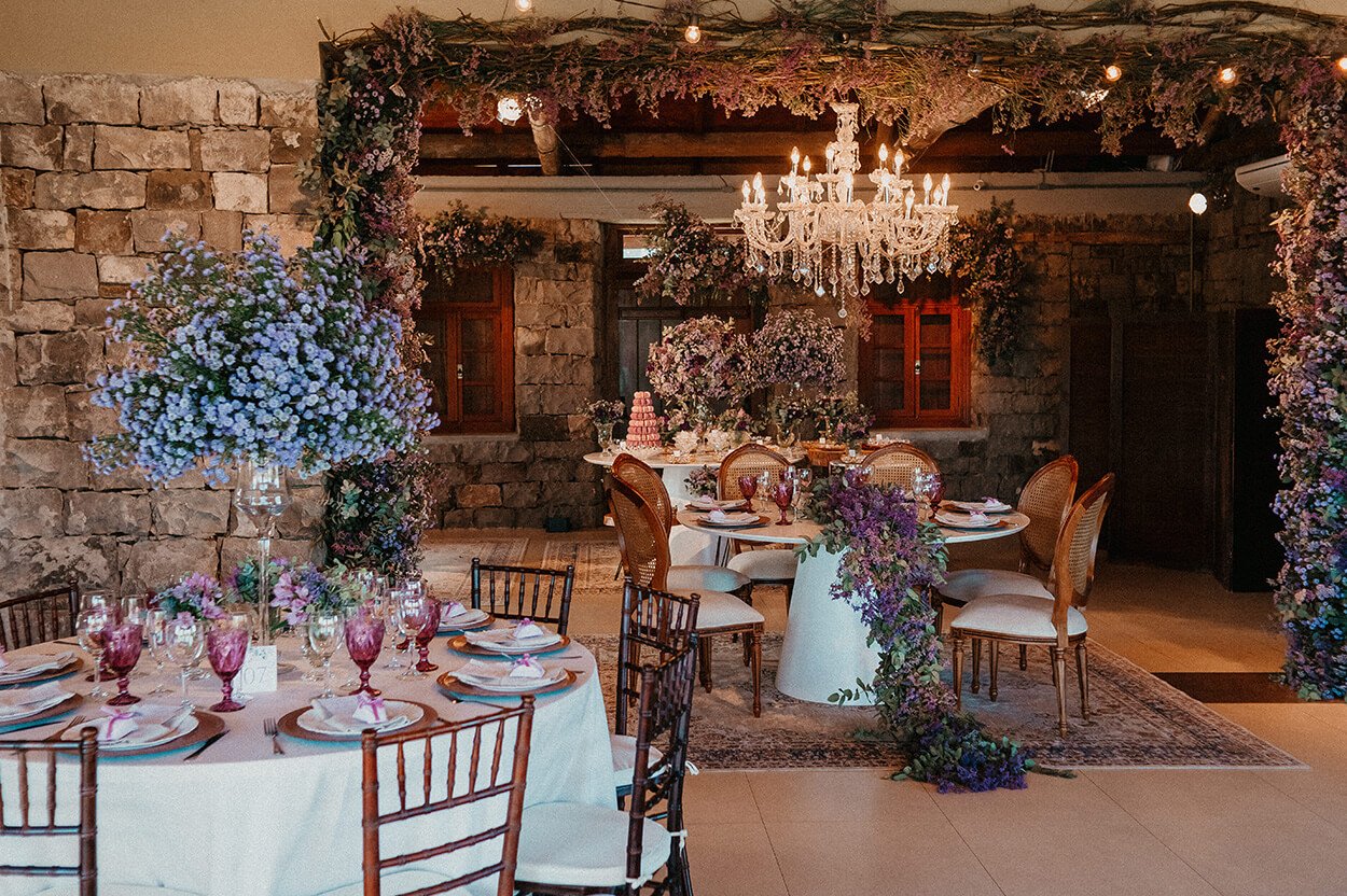 Os arranjos florais são o ponto alto da decoração, não tem como negar! Eles foram projetados para emoldurar todo o espaço com o seu charme e exuberância. E o resultado ficou incrível!