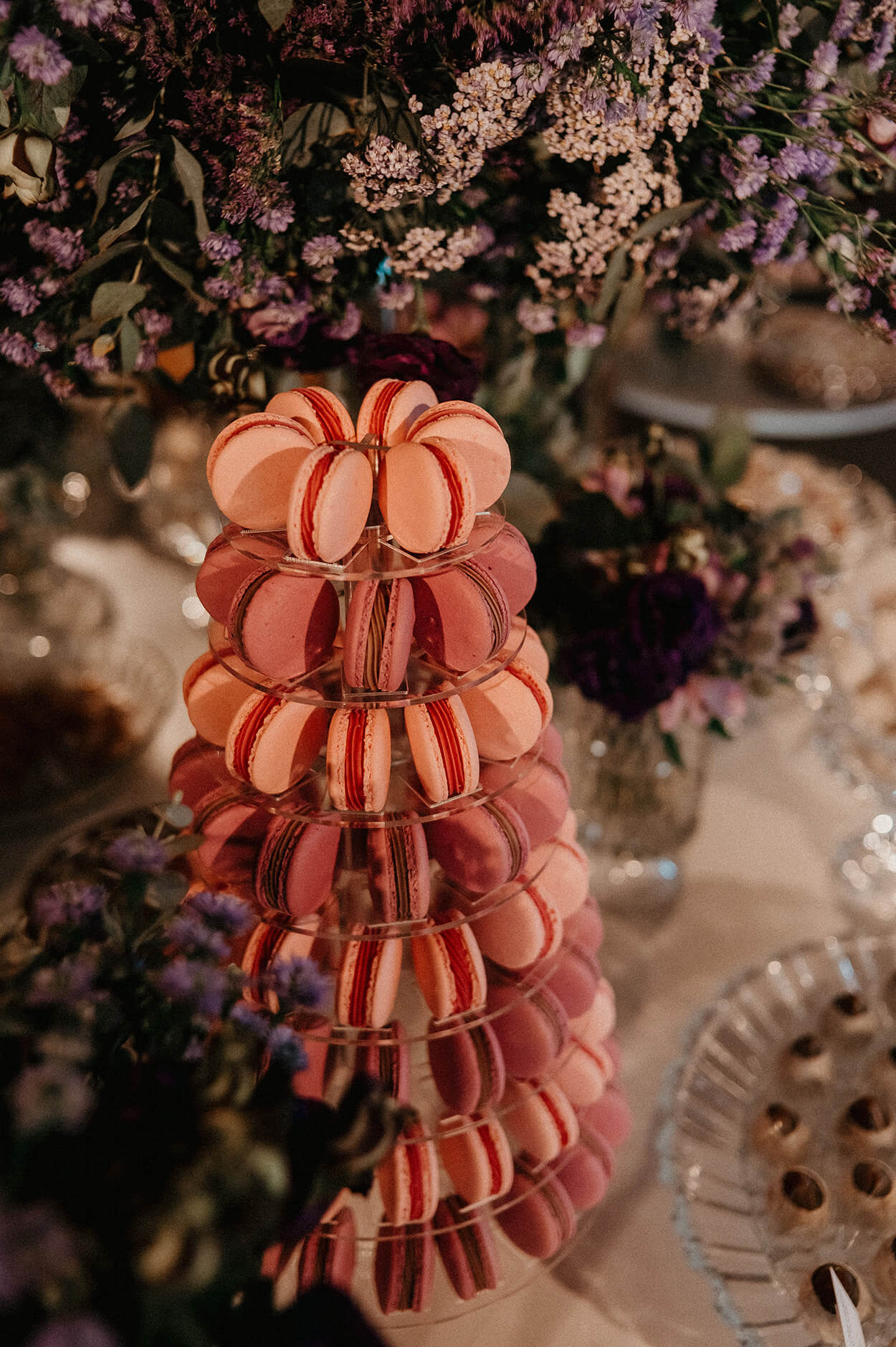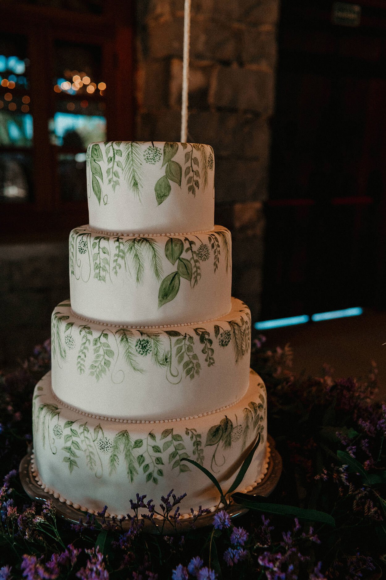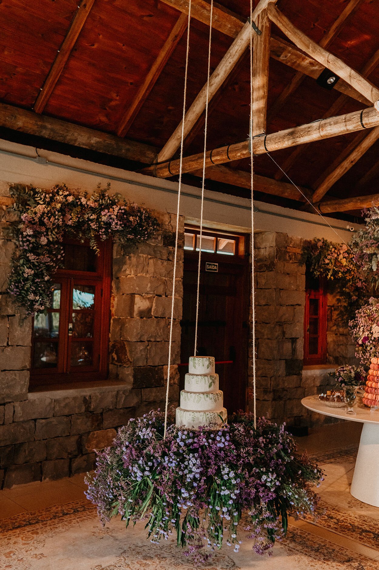 É impossível não comentar sobre a mesa suspensa do bolo com um toque maxi e romântico. O bolo também é uma obra de arte, todo pintado com motivos botânicos delicados.