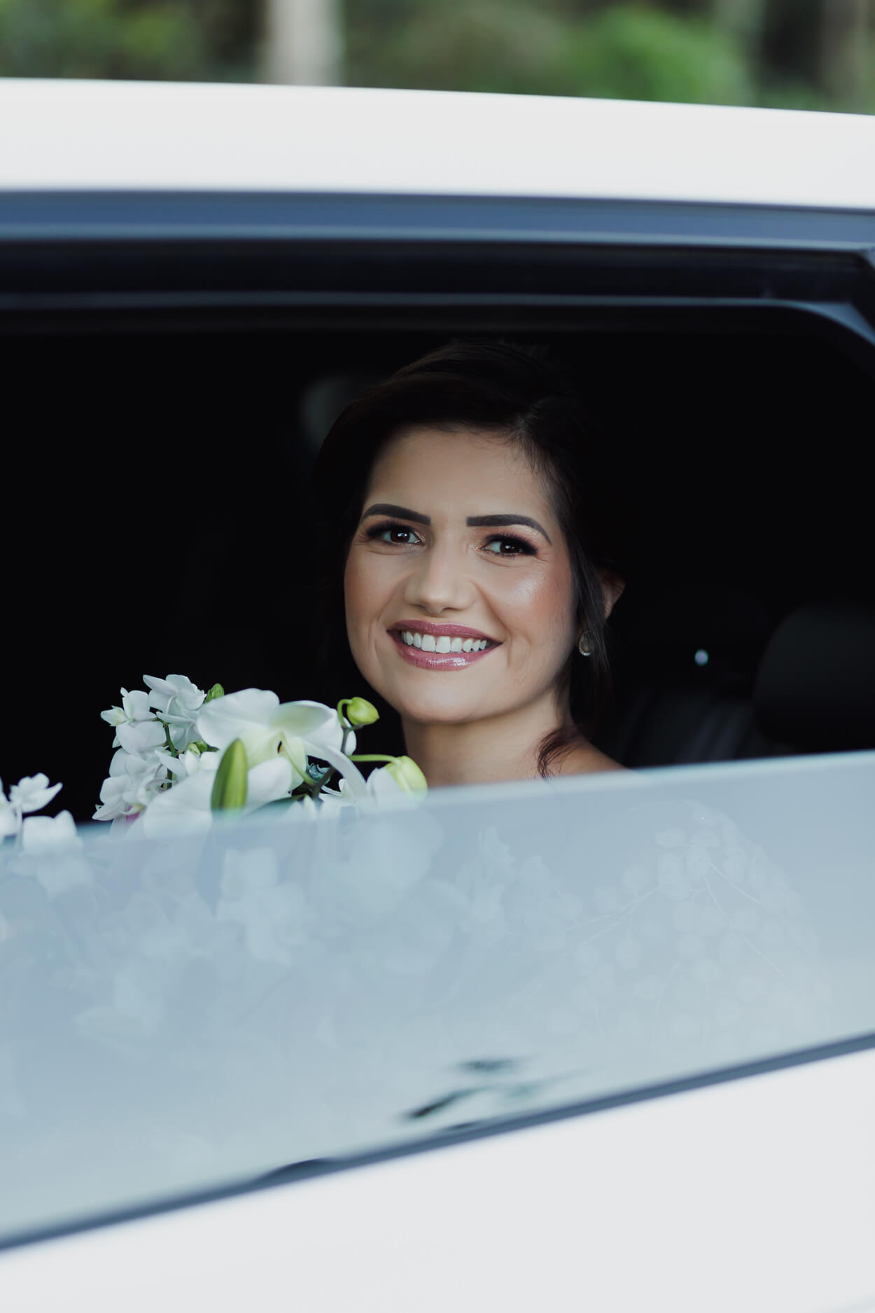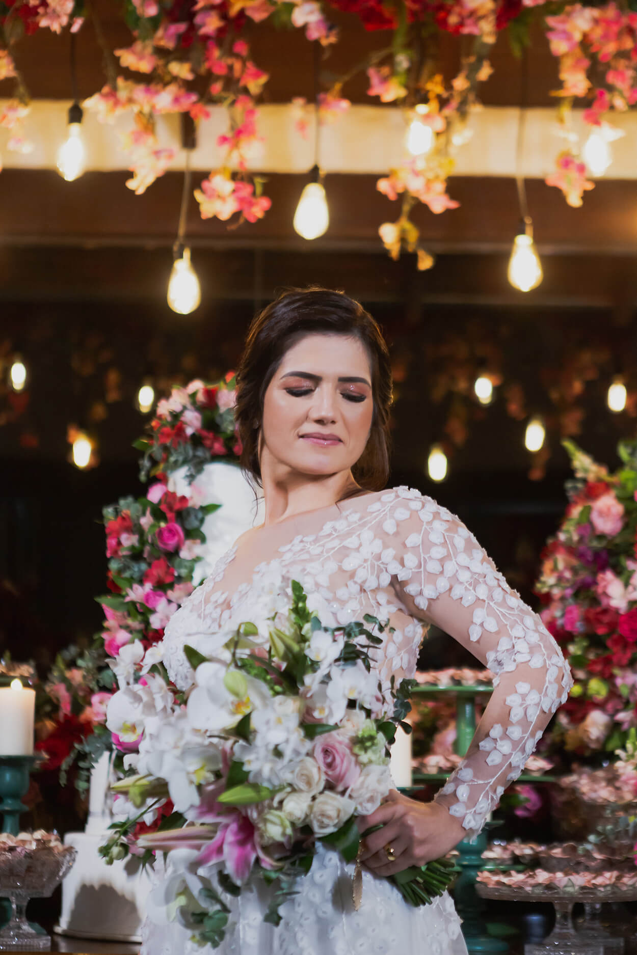 A composição com rosas, orquídeas, lírios e também folhas de eucalipto foi a aposta certa para finalizar o look com muita elegância.