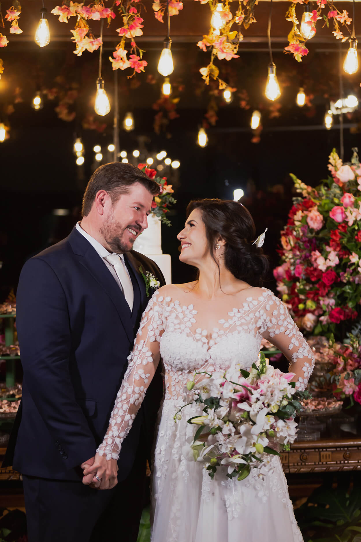 Precisamos destacar a exuberância da mesa do bolo! A mesa estava completa, com direito a muitos docinhos, um super bolo com 5 andares e arranjos florais ousados. O buquê não poderia ter sido mais perfeito.