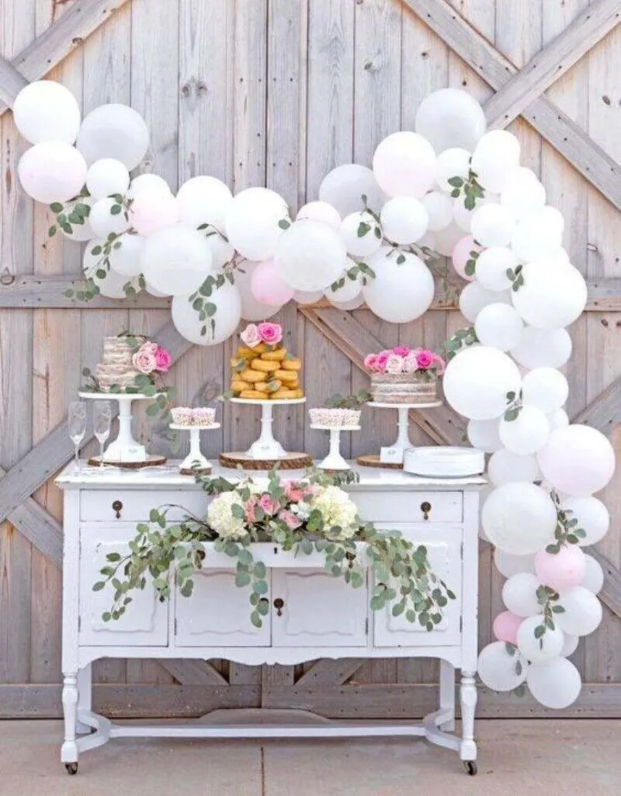 Aposte em cores neutras, arranjos de flores (pequenos), balões para compor um mobiliário e até barris forrados para servir como mesa.