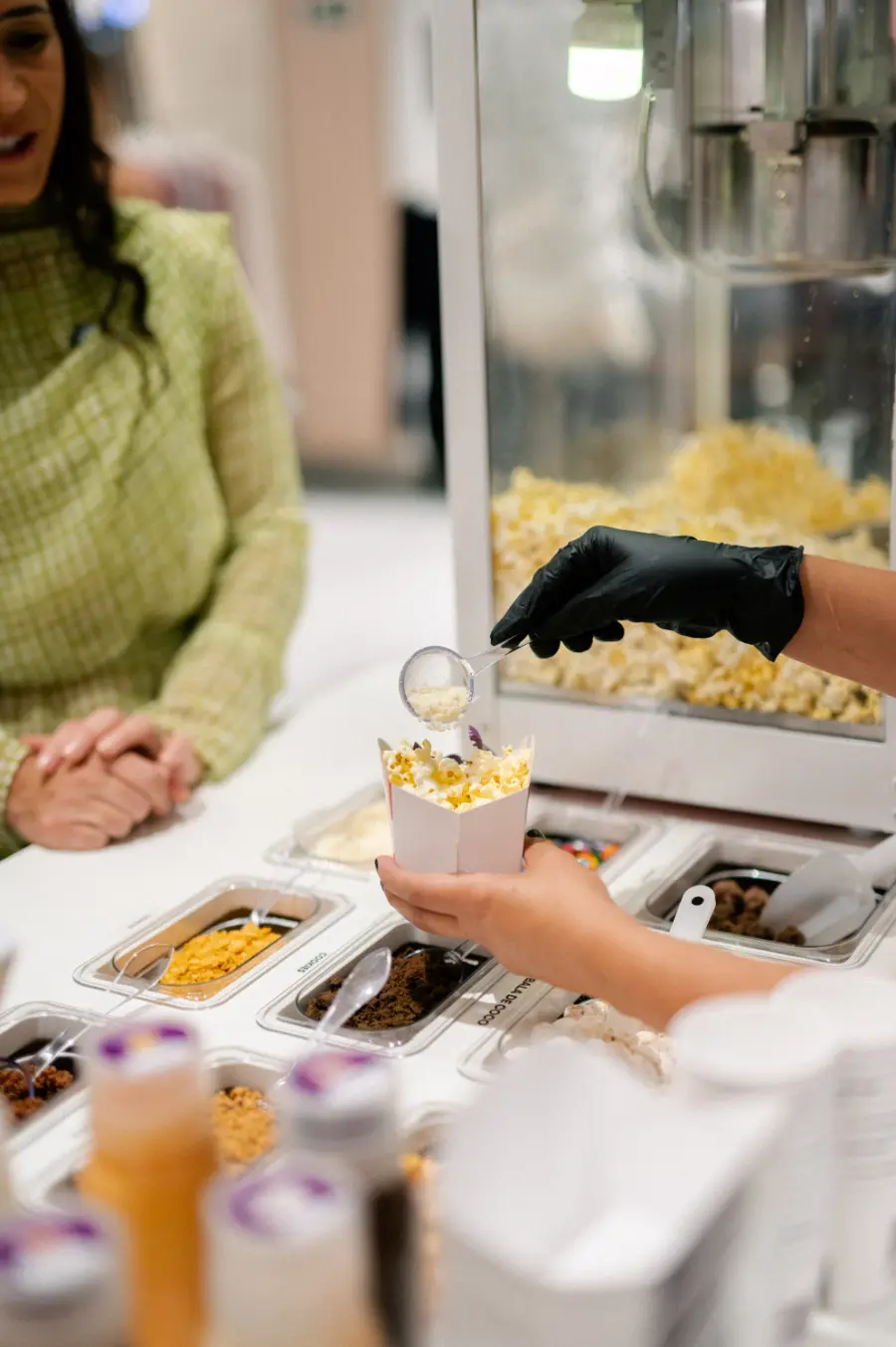 Um dos pontos altos do chá da Jaque foi a estação de pipocas gourmet da Pripoca Pipoca Gourmet onde cada convidada podia montar sua pipoca salgada ou doce com vários toppings na hora.