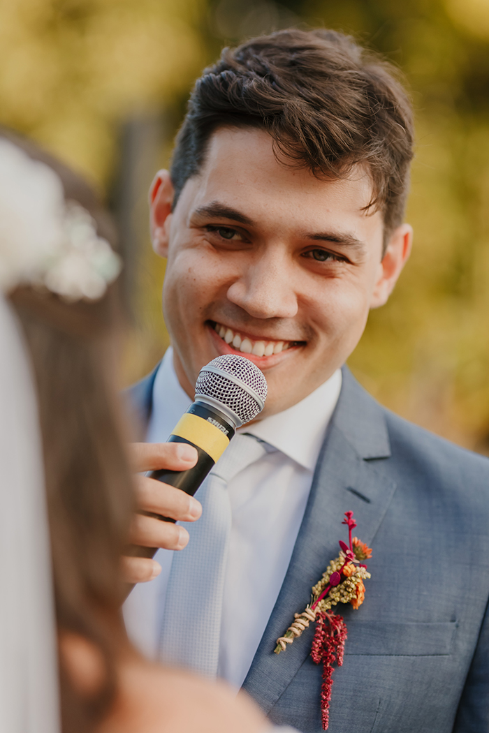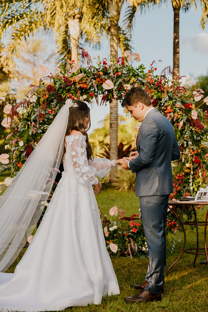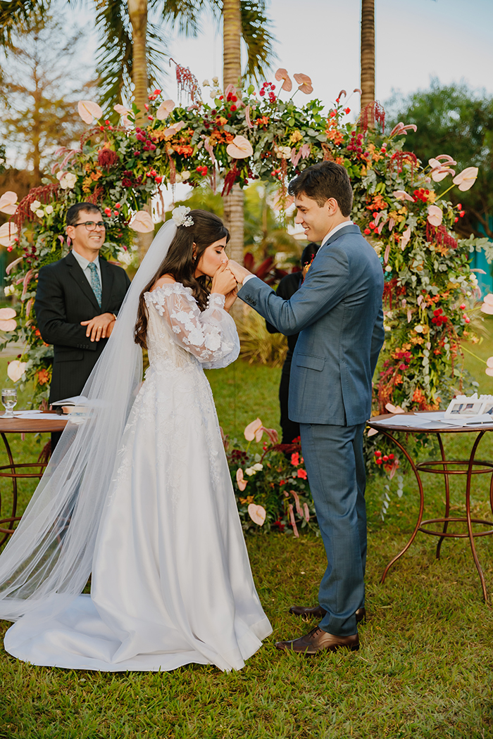 Para Letícia foi a leitura dos votos que fez seu coração bater mais forte com as palavras doces de seu amado. E também: “Quando a minha mãe me ajudou a vestir o vestido e a minha entrada”.