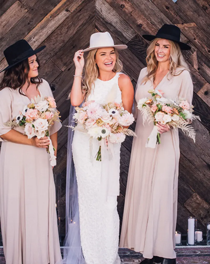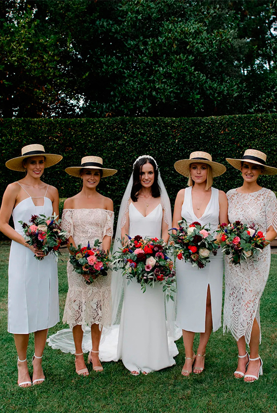 Capeline (floppy), Fedora, Boater (canotier) e Clôche são escolhas sofisticadas e estilosas, que podem destacar as madrinhas sem ofuscar a noiva.