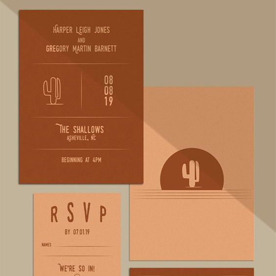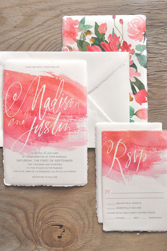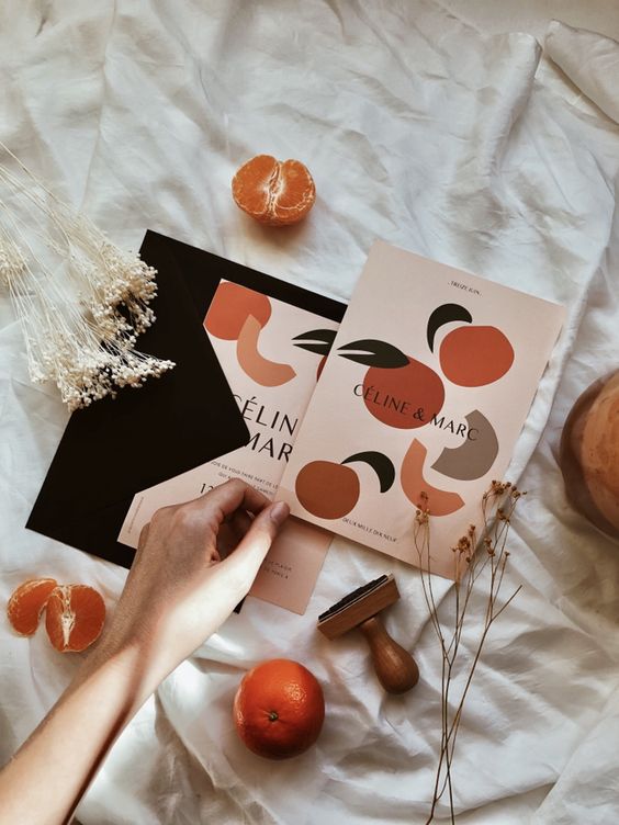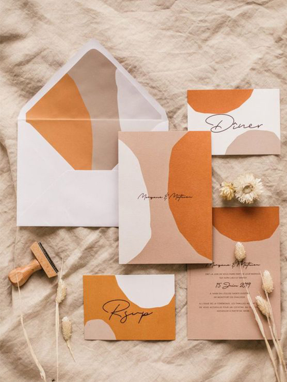 Com os casamentos tropicais e folk em alta, os convites estão acompanhando os temas: de tons terrosos aos neon, passando por tons escuros como roxos e preto, não existe restrição ao uso de cor em convites.
