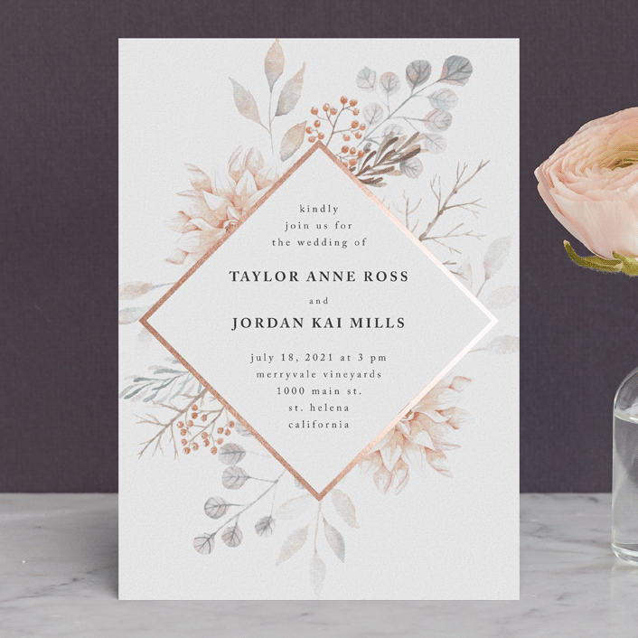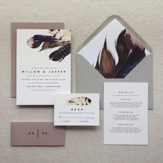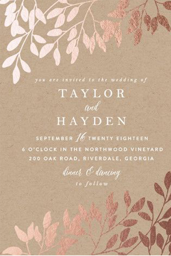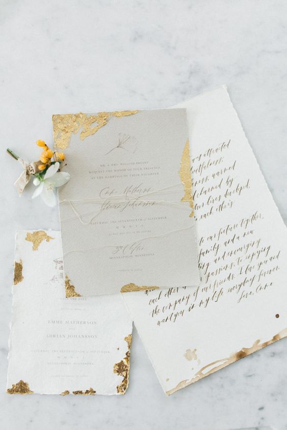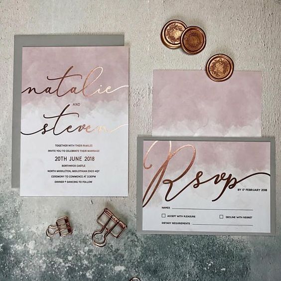 Que as impressões metalizadas de baixo e alto relevo se destacam em todos os estilos de convites de casamento já é quase um clássico. A novidade é usar a técnica para destacar outros elementos do convite, como uma ilustração, aquarela ou lateral do papel. Ouro e cobre são bastante utilizados, mas o rosé gold leva a taça!