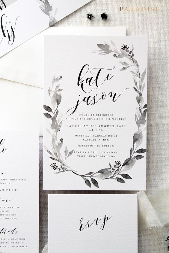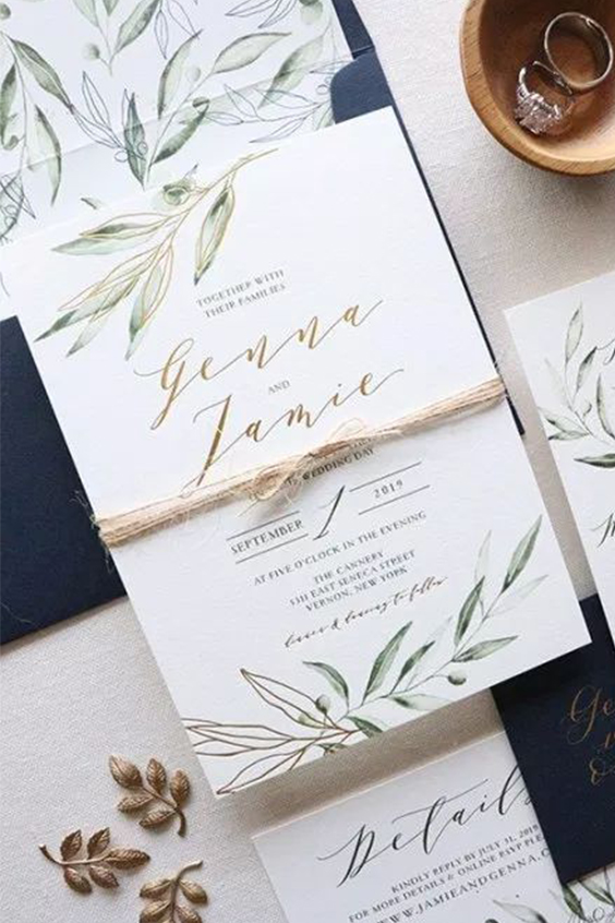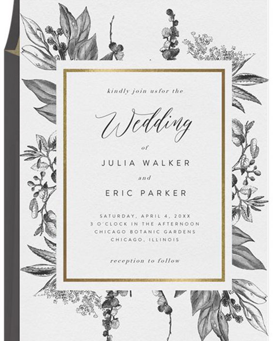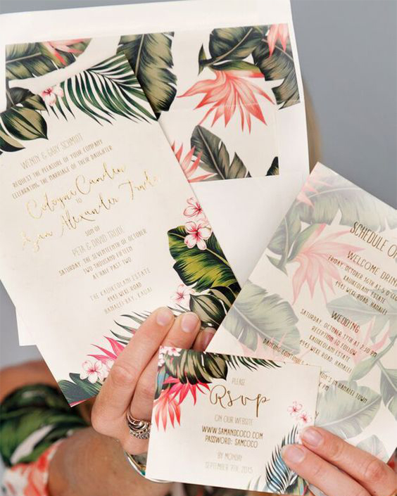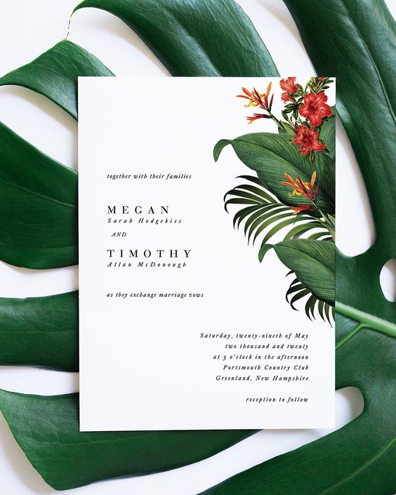 As estampas florais são as queridinhas dos noivos que desejam apostar em um casamento romântico. Para deixar seu convite com um ar contemporâneo, escolha um design mais arrojado, inclua elementos tropicais e/ou inclua as folhagens e flores queridinhas do ano: antúrios, costelas de Adão, samambaias e musgo.