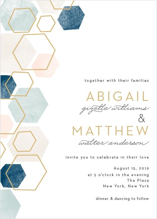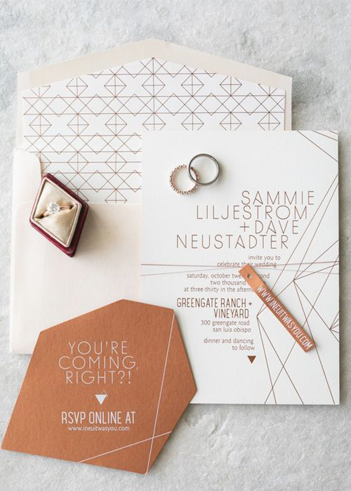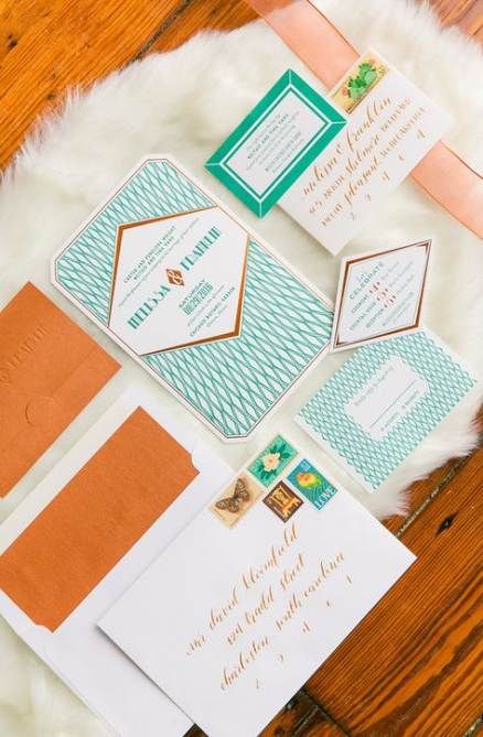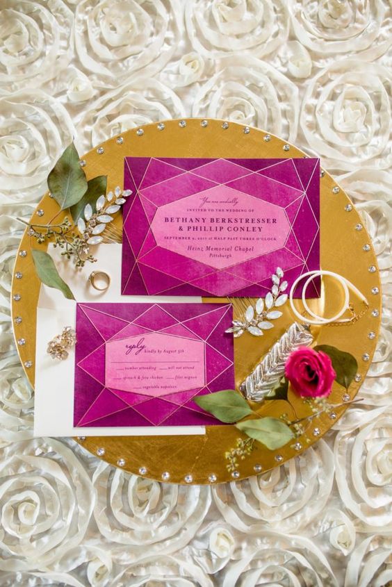 As estampas geométricas vieram com tudo, e prometem ficar em 2020! Geralmente, estas estampas são criadas com acabamentos metalizados ou com elementos botânicos. Elas podem ser tanto a estrela do design como um complemento para o forro do envelope ou fundo do convite.