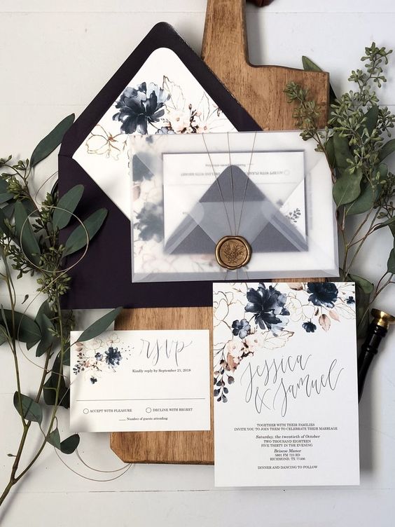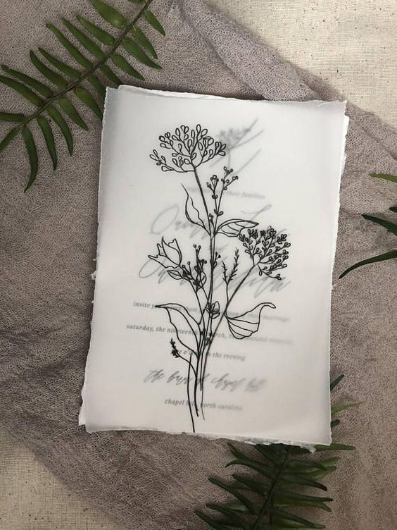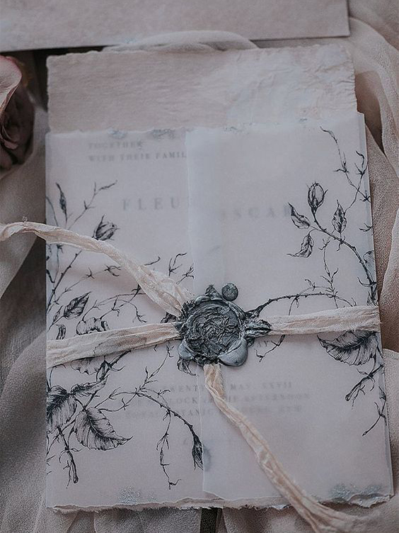 O papel vegetal está entre as principais escolhas para os convites de casamento, principalmente para os modelos rústicos com estampas florais! Além do papel vegetal, o papel pergamenata também se destaca pelo efeito de transparência.