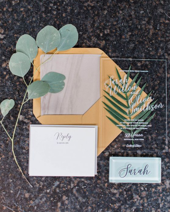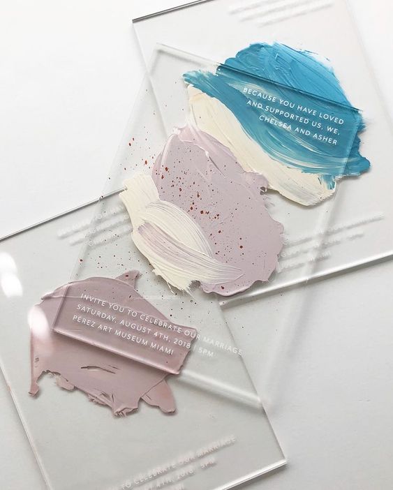 Os convites com algum tipo de transparência vêm ganhando cada vez mais espaço no coração dos noivos, e os principais acabamentos escolhidos são os convites em acrílico e convites em acetato.