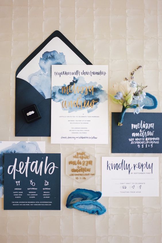 A arte feita em aquarela é a forma perfeita de deixar seu convite personalizado, com a essência do casal. Ela não é uma técnica nova, mas em 2020 o tema não é botânico nem de cenas bucólicas: do ombré aos tons de pedras preciosas, a aquarela se renovou e vamos ver muitos convites feitos com “manchas orgânicas”.