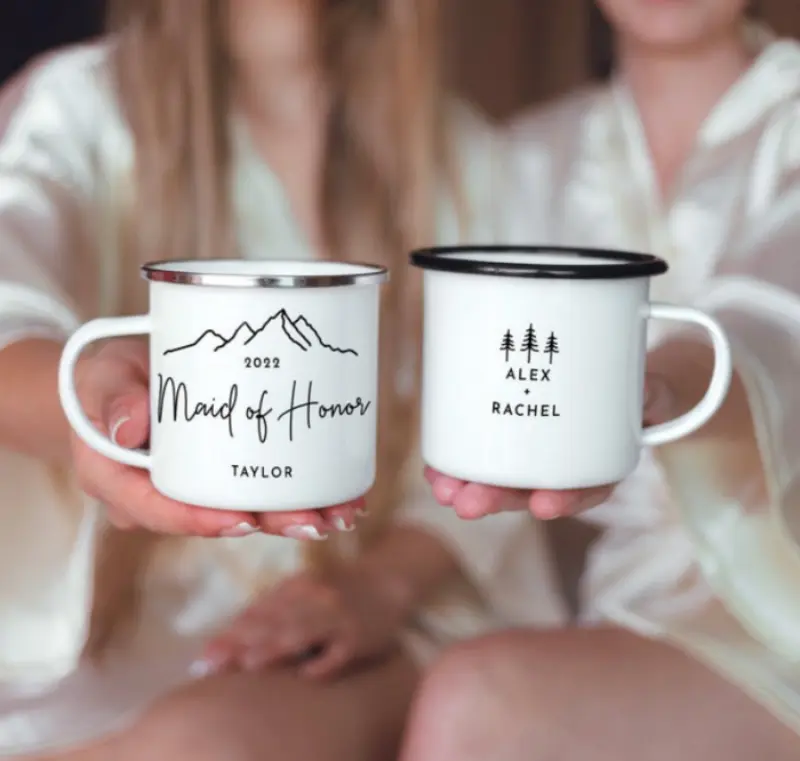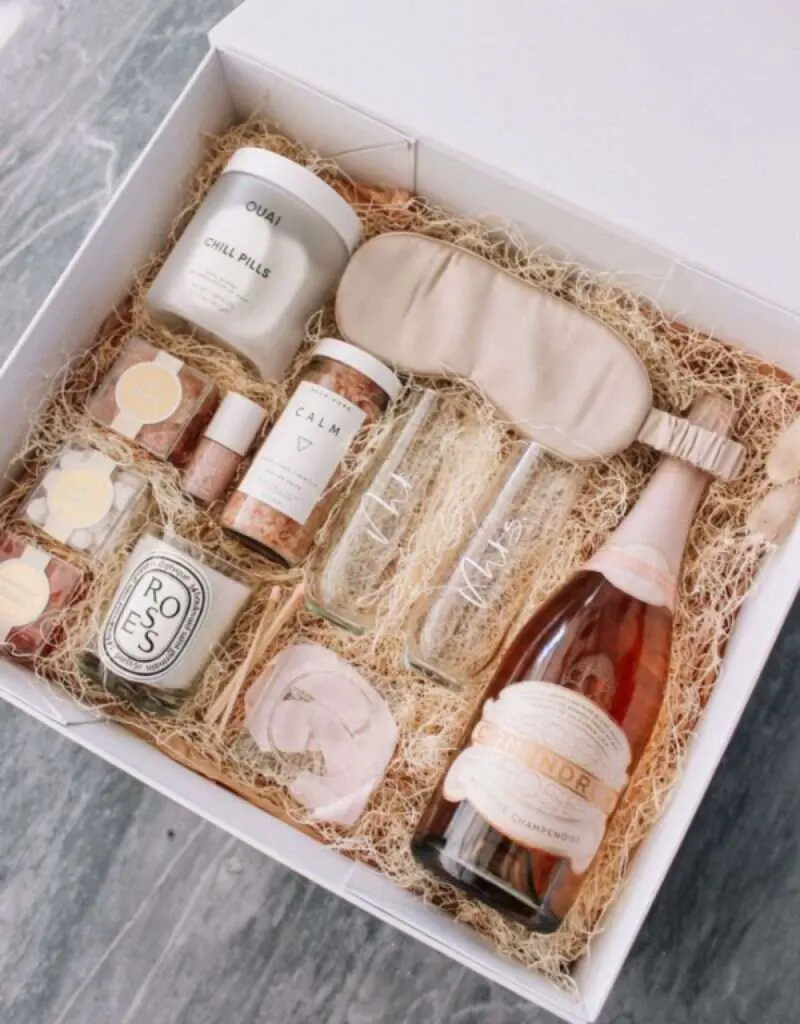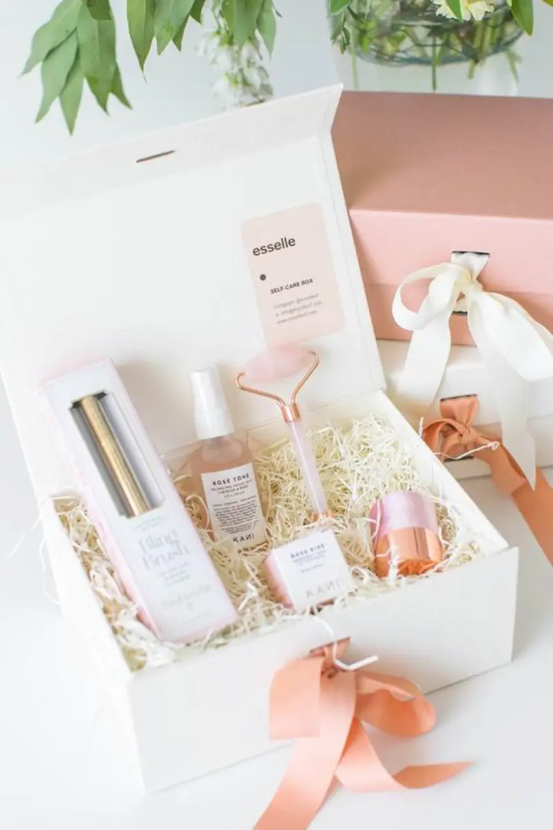 São diversas possibilidades, entre: itens personalizados, lembrancinhas que combinem com o estilo do casamento, acessórios, bebidas em miniatura, doces, plantas, sabonetes.