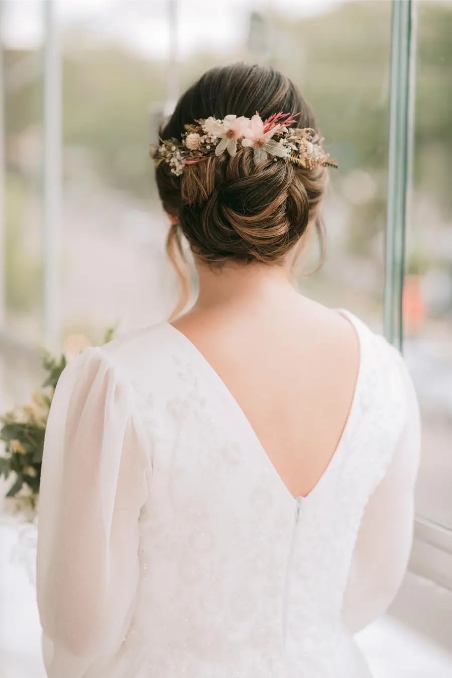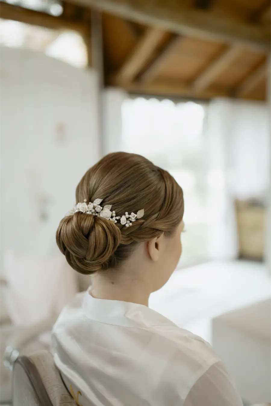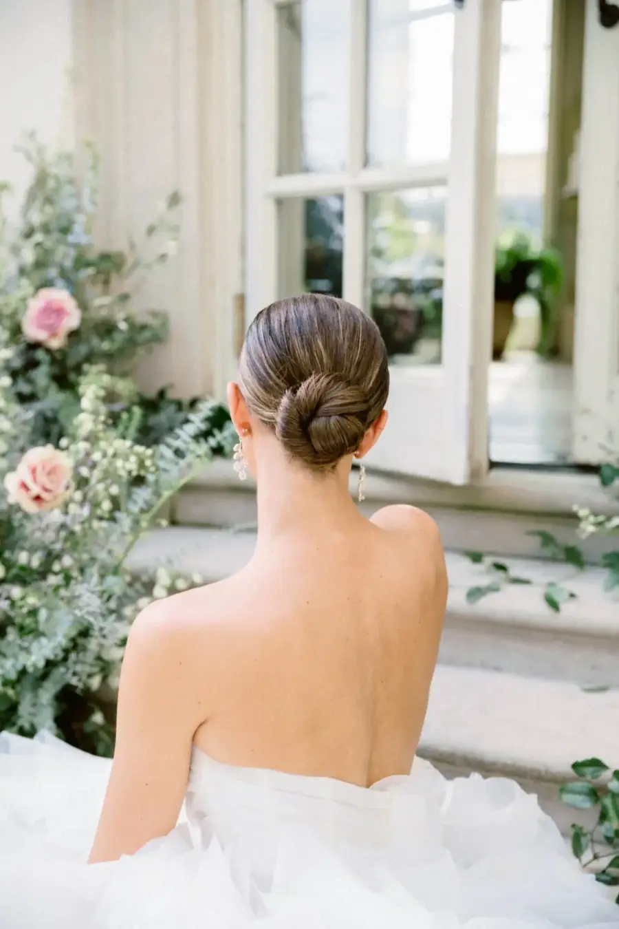A noiva escolhe o coque porque é um penteado versátil, duradouro e que valoriza o rosto. Além disso, ele harmoniza com diferentes estilos de vestido e acessórios.