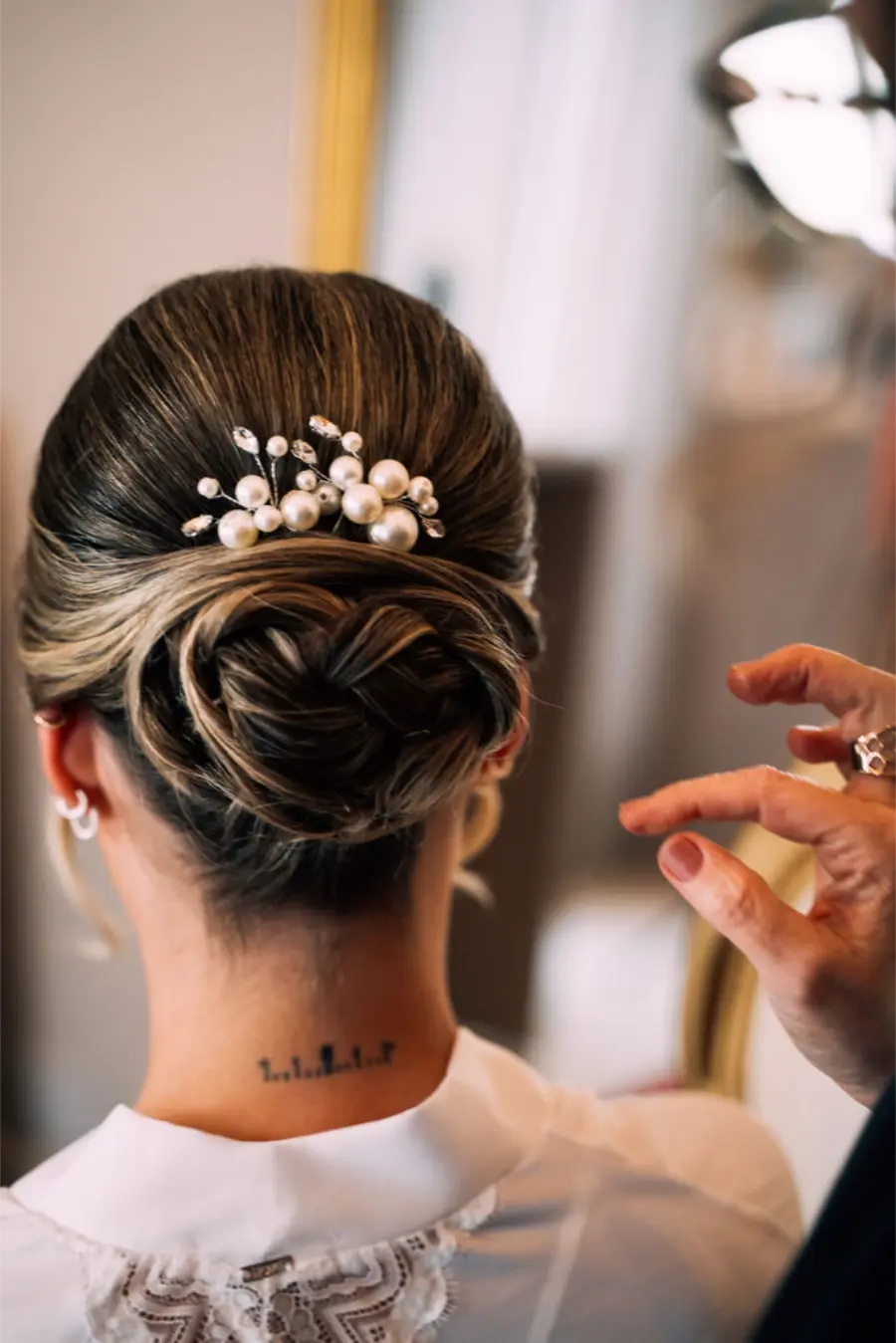 Presilhas, grampos e tiaras ajudam a manter o coque firme e charmoso. Ele é ótimo para noivas práticas, que querem unir modernidade e romantismo.